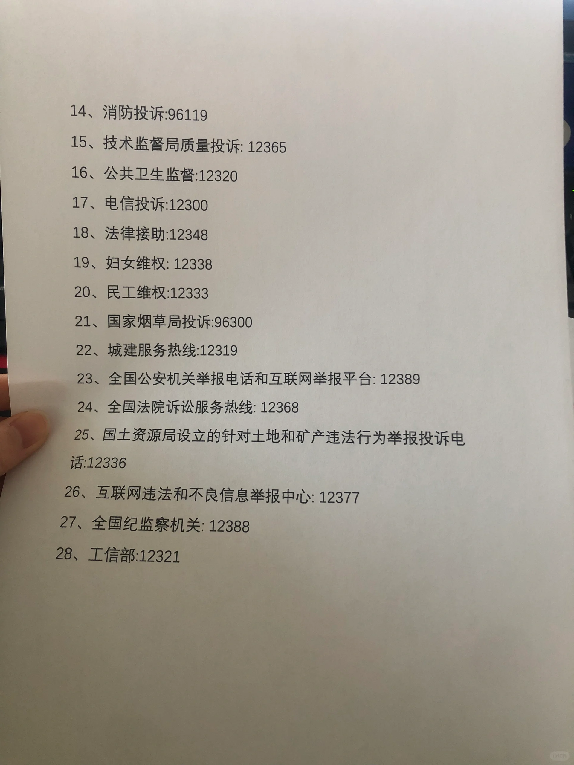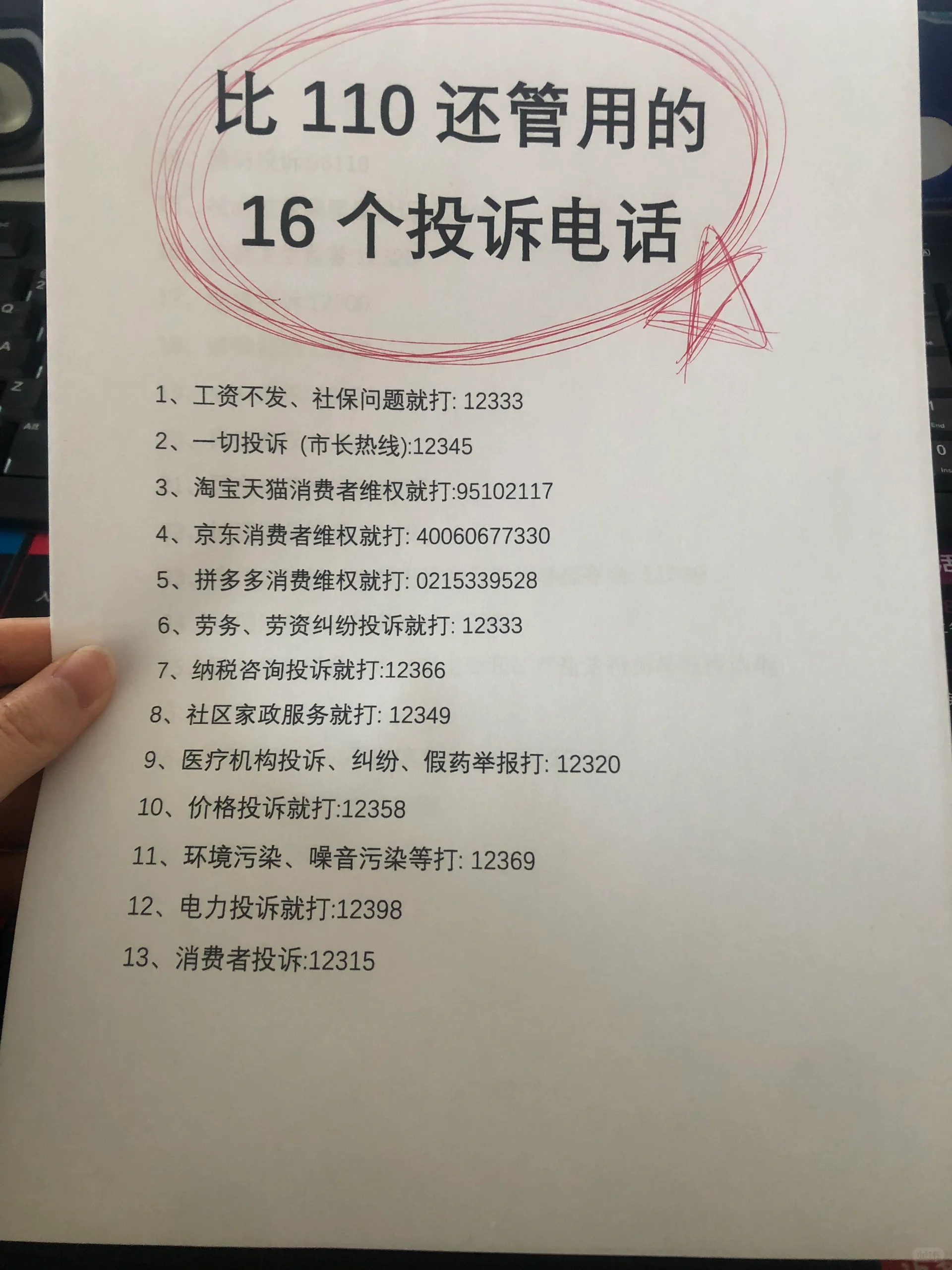 维权时需要记住的16个电话号码: 消费者权益热线: 1。12345市长开放热线。如果您遇到任何需要投诉的本地问题,您可以拨打此号码。 二、。12348司法局法律援助电话。您可以拨打此号码进行免费法律咨询。 12333劳动局劳动保障热线3号。工人们抱怨诸如工资扣减和未签订合同等劳动问题。 四、12389全国公安举报电话及网络举报平台。 五、12309全国检察机关统一举报热线、职务犯罪举报专线 全国法院诉讼服务热线12368主要用于案件信息查询、诉讼指导、协助联系法院工作人员。 七、。12388国家纪检监察机关受理群众对党员、领导干部和国家公务员违反党纪政纪的举报和控告。 第八,12358物价局统一通报损害消费者、经营者或者国家利益的产品价格行为。 9。国家质量局负责受理与产品质量、计量、标准化等方面有关的申诉、投诉、举报、产品质量咨询和产品防伪查询。 12338号全国妇联妇女维权热线主要为妇女儿童提供法律、婚姻、家庭、心理、教育等方面的咨询,受理与侵害妇女儿童案件有关的投诉。 11。12328交通运输部服务监督、投诉举报、咨询服务,包括道路运输、公路、水路等行业。 12。12377是互联网违法不良信息举报中心,是互联网上各种违法不良信息的举报中心 十三、12336国土资源局建立了举报和投诉非法土地和矿产活动热线。 十四条,12319条经城市建设部和信息产业部确认的城市建设服务热线,涉及公共交通、供水、燃气、供暖、违章建筑等方面 十五、12315市场监督管理局解决消费者因日常消费、使用商品、接受服务、经营行为等违反社会监督管理法律法规的举报。消费者权益保护