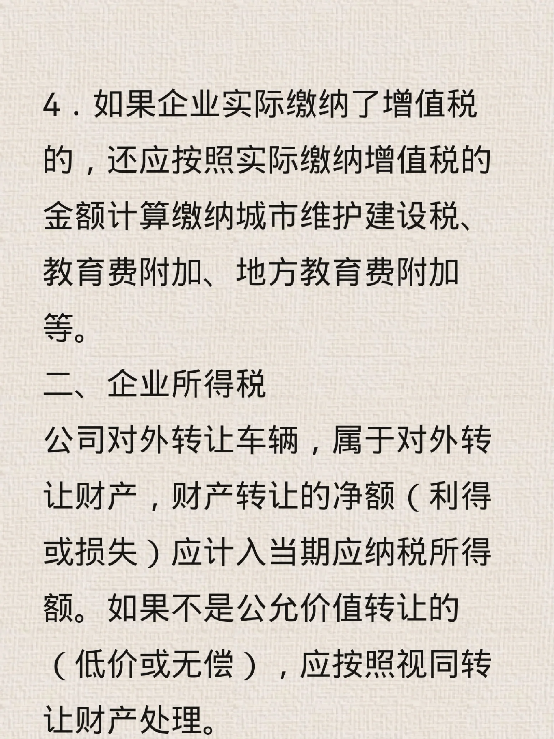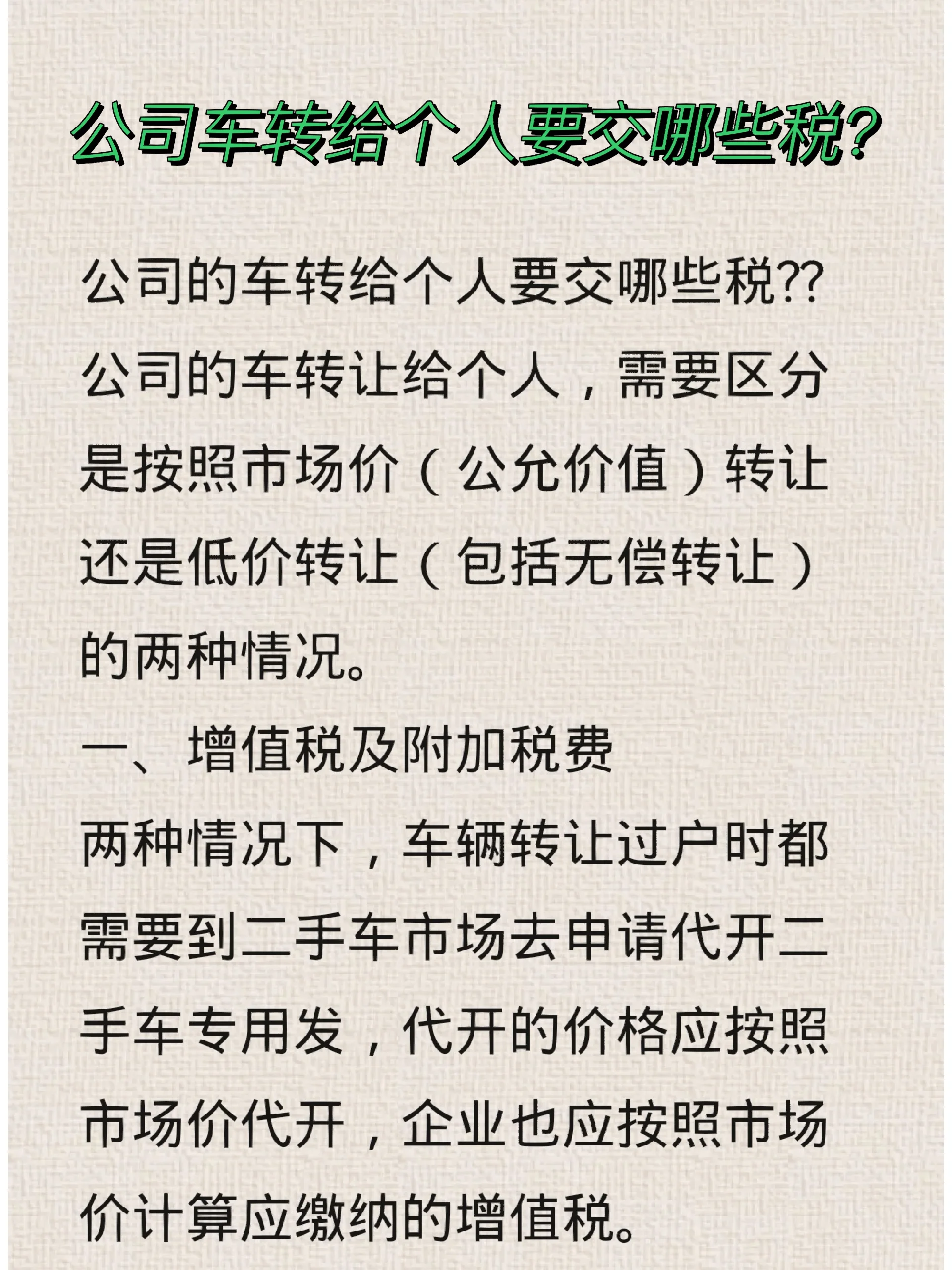 公司将汽车转让给个人时需要缴纳哪些税款 当将公司的汽车转让给个人时,需要区分两种情况:以市场价格(公允价值)转让或以低价转让(包括免费转让)。 1、 增值税及附加 在这两种情况下,在转让车辆所有权时,都需要在二手车市场申请二手车经销商。经销商的价格应以市场价格为基础,企业还应以市场价为基础计算应缴纳的增值税。 1、符合销售用固定资产简易计税条件的,企业可适用在3%税率基础上减征2%税率的简易计税方法。 2、不符合出售旧固定资产简易计税条件的,一般纳税人应当按照销售货物13%的税率计算应纳税额。 3.如果小规模纳税人在2022年4月1日至12月31日期间有资格免征增值税。 企业实际缴纳增值税的,还应当按照实际缴纳的增值税税额计算缴纳城市维护建设税、教育费附加、地方教育费附加等。 2、 企业所得税 公司对外转让车辆构成财产转让,财产转让的净额(收益或损失)计入当期应纳税所得额。如果不是公允价值转让(低价或免费),则应视为转让财产。 3、 印花税 因为对方是个人,根据印花税法,转让车辆的合同属于销售合同。如果对方是个人,他们可以享受印花税豁免,因此不需要缴纳印花税。 4、 个人所得税 如果按市场价格(公允价值)转让,则不涉及个人所得税;如果以非公允价值(低价或免费)转让,则涉及个人所得税。 1、低价或无偿转让给企业职工的,应当将市场价格与受让方“工资收入”的差额计入当月工资,并按照“工资所得”扣除个人所得税。 2.向公司投资者及其近亲属低价或无偿转让的,其差价应视为“股息收入”,并按20%的税率扣缴个人所得税。 3.低价或无偿转让对象与企业无关,如通过摇号活动获得的,应按“意外收入”扣缴个人所得税,税率为20%。 无论是公司的车还是私家车,在购买二手车之前,你都需要查看汽车的历史记录。一般情况下,您可以通过微信小程序“Cha Che Guan”快速查看车辆维修保养、保险和事故记录。防止购买事故车、洪水车和过热车汽车