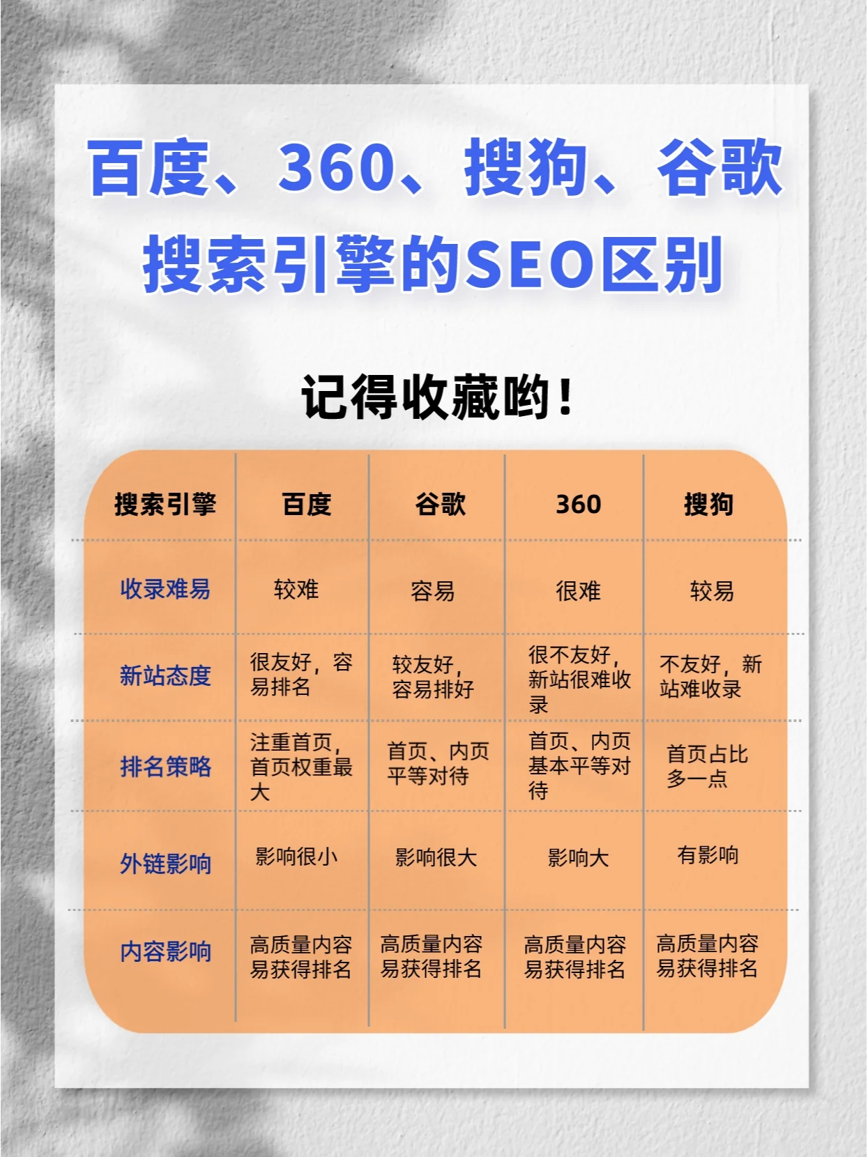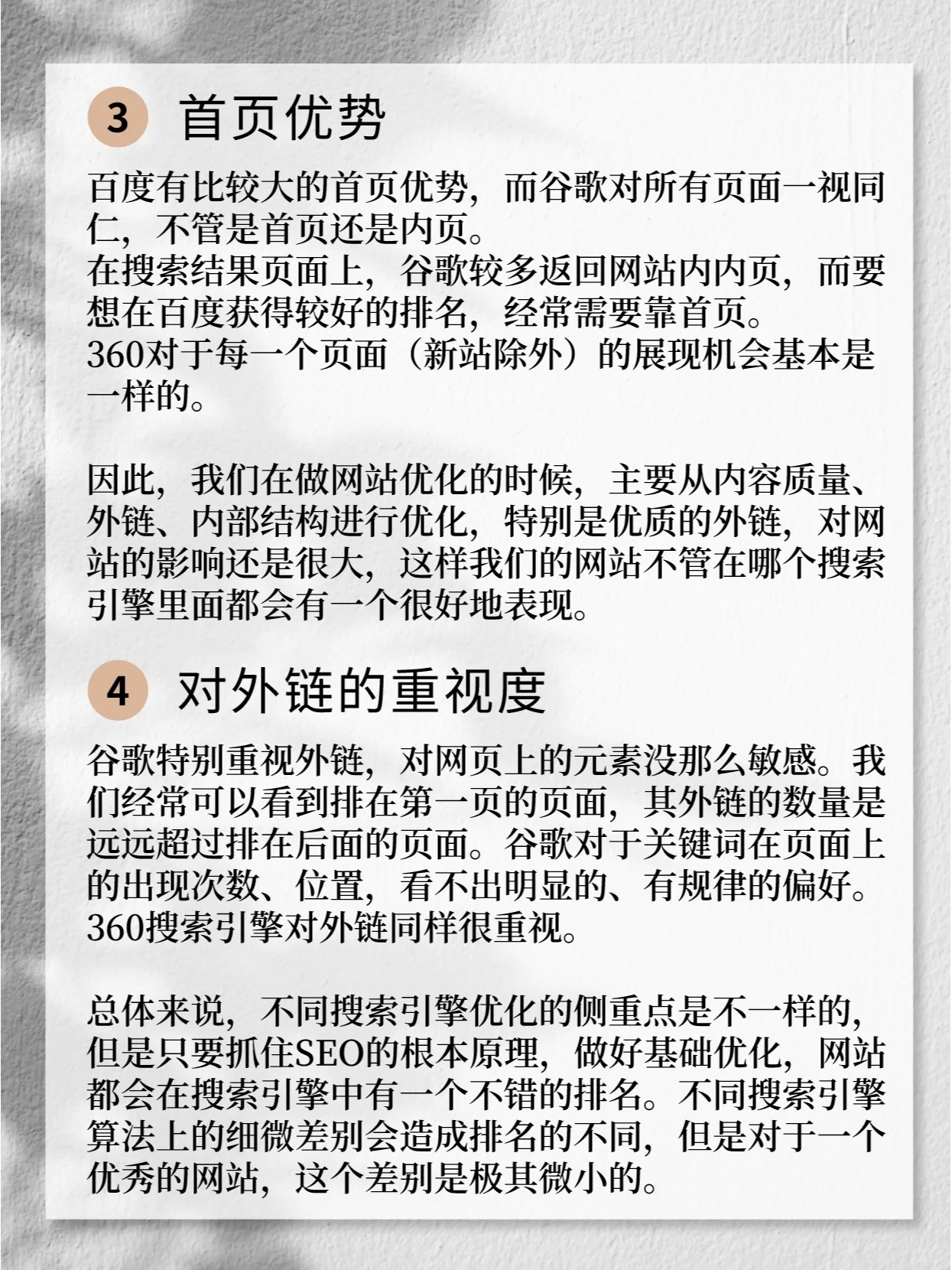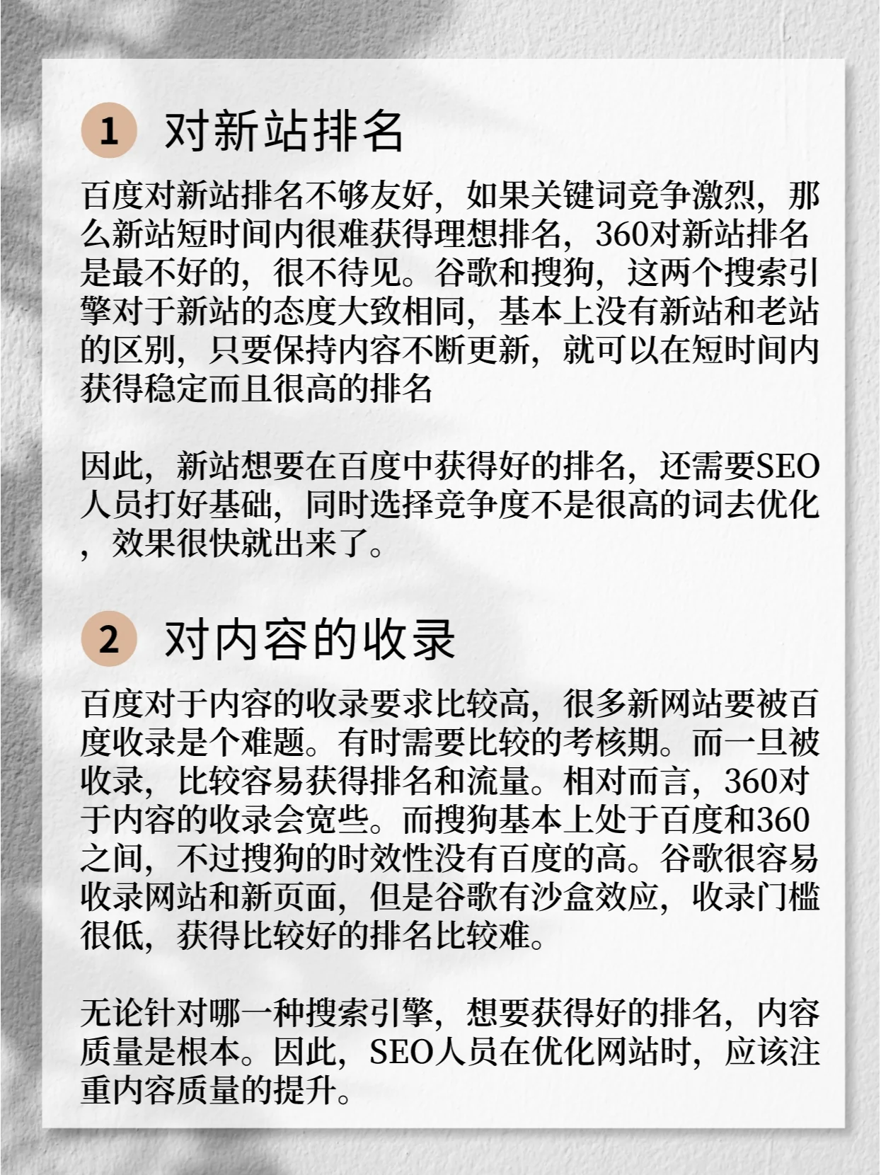 新网站排名 百度对新网站的排名不够友好。如果关键词竞争激烈,新网站在短期内很难达到理想的排名,360对新网站排名最差,不被看好吗。谷歌和搜狗对新网站的态度相似,但差别不大。只要内容不断更新,就能在短时间内实现稳定和高排名。 内容包含哪些内容 百度对内容收录的要求很高,许多新网站被百度收录是一个挑战。有时需要一个比较评估期。一旦包括在内,就更容易获得排名和流量。相对而言,360会有更大范围的内容包容。搜狗基本上介于百度和360之间,但它的时效性没有百度的高。谷歌很容易包含网站和新页面,但它有沙盒效应,包含门槛低,很难获得好的排名。 主页优势 百度拥有显著的主页优势,而谷歌对所有页面一视同仁,无论是主页还是内部页面。在搜索结果页面上,谷歌会返回更多的网站内部页面。要想在百度上获得好的排名,往往需要依靠主页,360的每个页面(除了新网站)的显示机会基本相同。 对外部联系的重视程度如何 谷歌非常重视外部链接,对网页上的元素不那么敏感。我们经常看到,第一页的外部链接数量远远超过第二页。谷歌对页面上关键词的频率和位置没有明确而系统的偏好。360搜索引擎是否也非常重视外部链接。