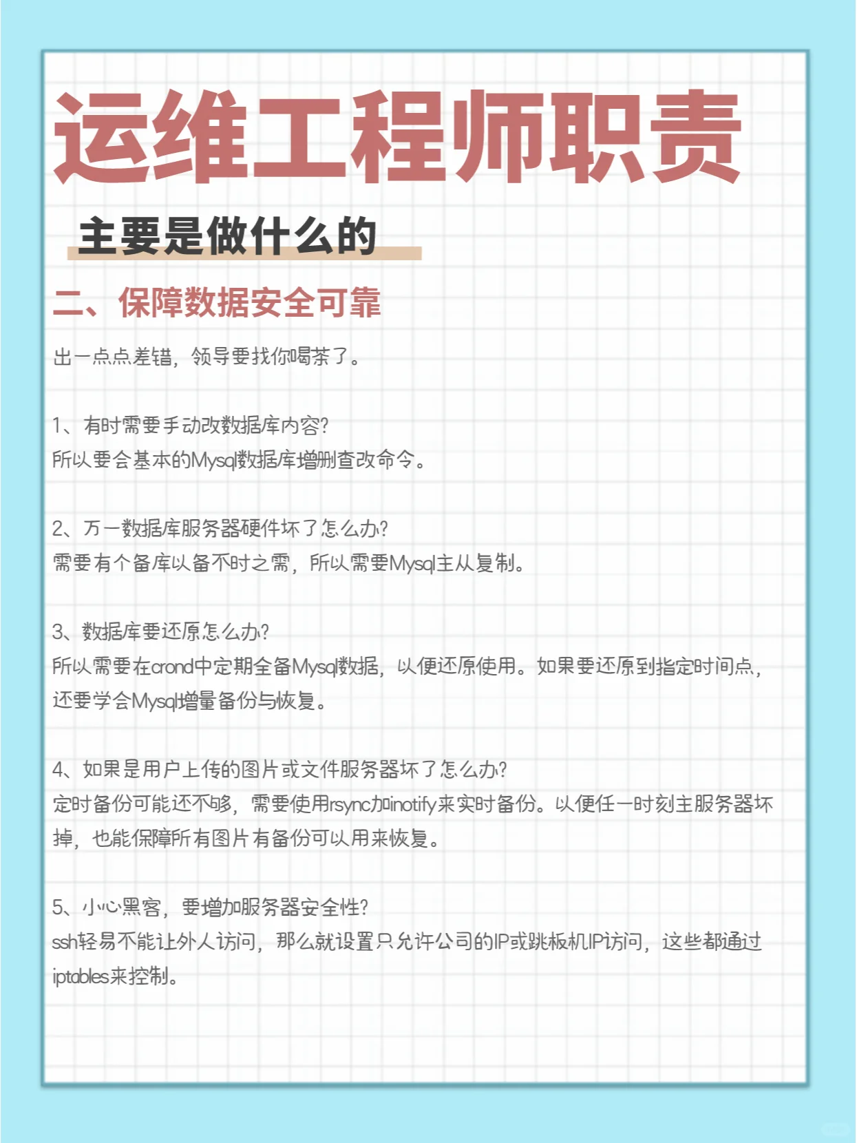 综上所述,就是要保证业务(如网站服务器、游戏服务器等)的长期稳定运行,同时保证数据(如用户名和密码、游戏数据、博客文章、交易数据等)的安全性和可靠性