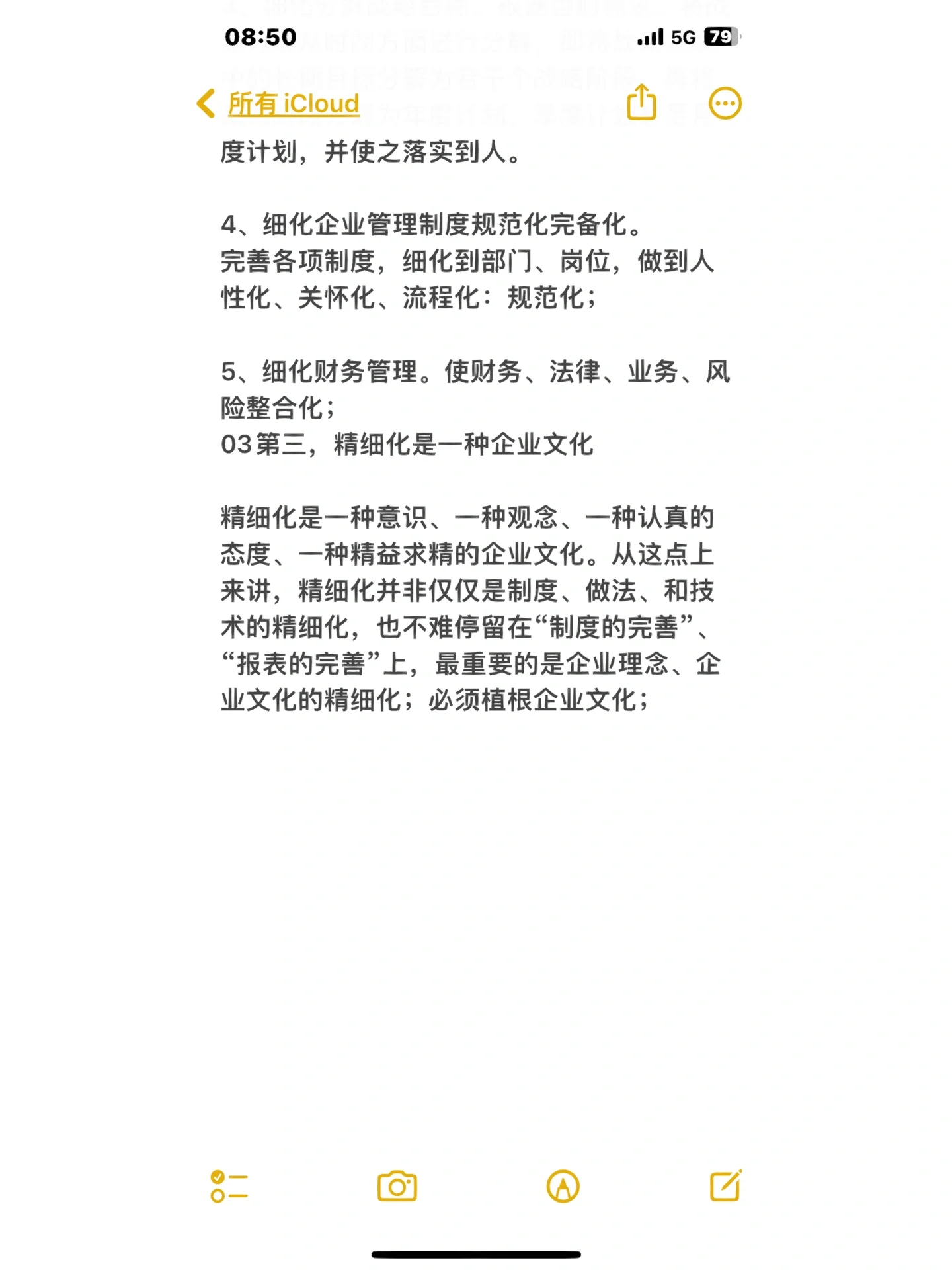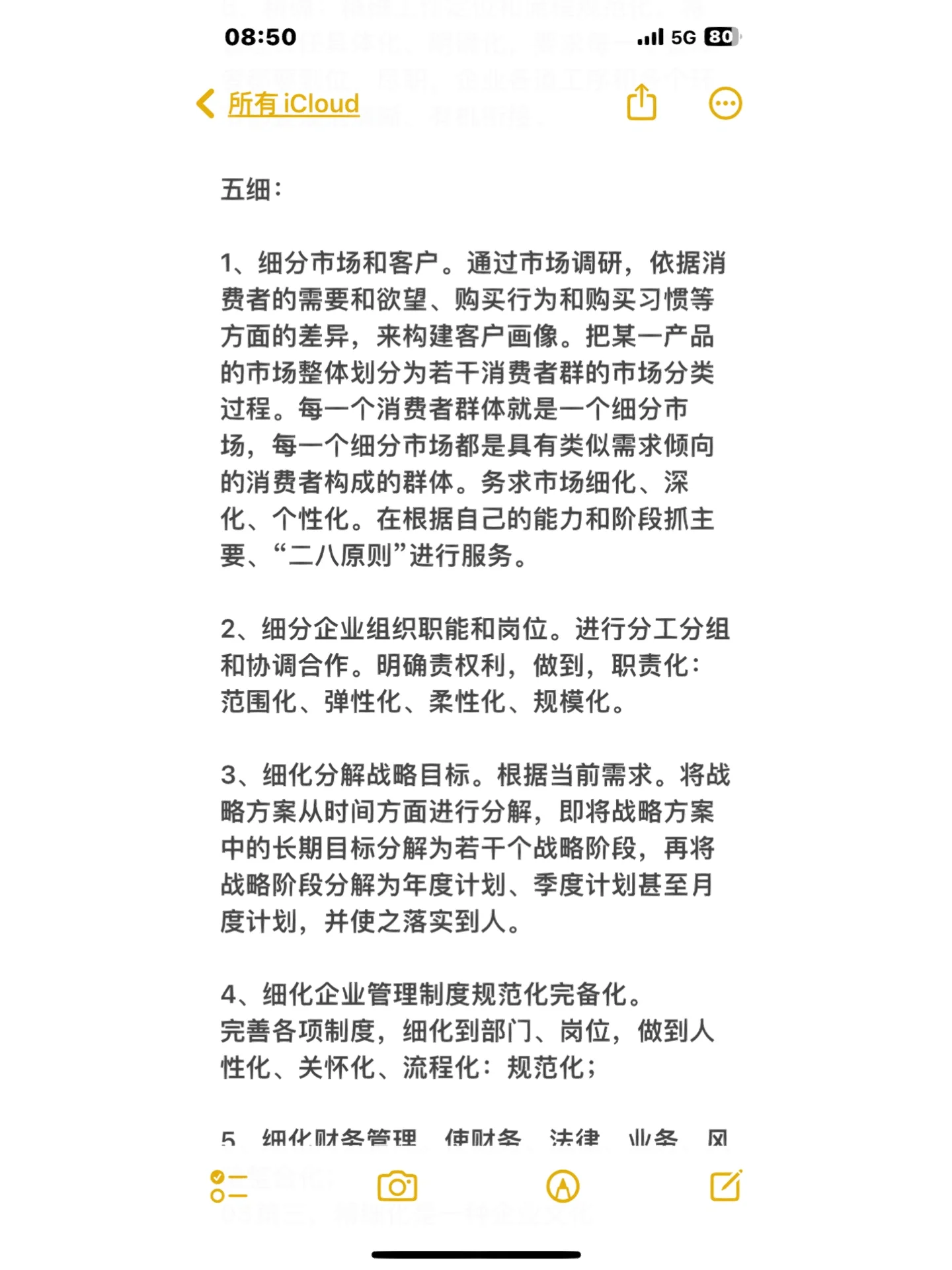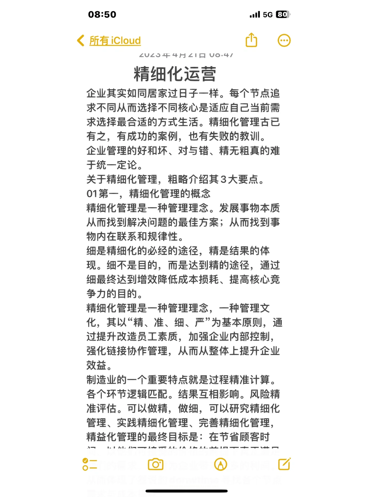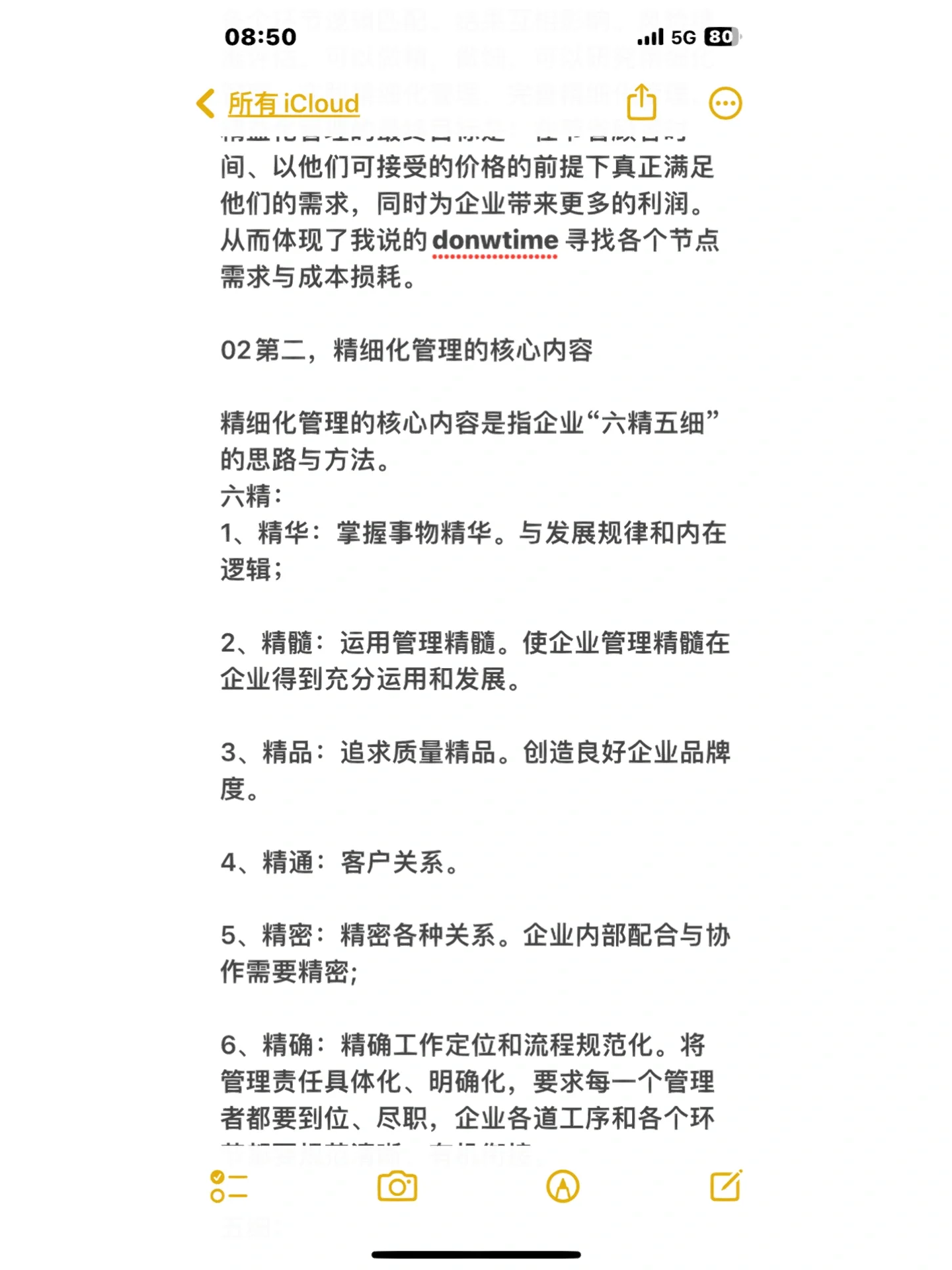 大致介绍精细化管理的三个要点。 01一、精细化管理理念 精细管理是一种管理哲学。开发事物的本质,找到解决问题的最佳方法;从而找到事物的内在联系和规律。 精细是实现精细化的必要途径,精确是结果的体现。精细不是目标,而是实现精确的方法。通过精细化,最终目标是提高效率,减少成本损失,提高核心竞争力。 精细化管理是坚持“精、准、细、严”基本原则的管理哲学和管理文化。通过提高和转变员工素质,加强企业内部控制,加强协同管理,可以提高企业的整体效率。 制造业的一个重要特征是对工艺的精确计算。匹配每个环节的逻辑。结果相互影响。准确的风险评估。精益管理的最终目标是真正满足客户的需求,同时节省时间,提供可接受的价格,同时为企业带来更多利润。 这反映了我所说的在Donwtime中查找每个节点的需求和成本损失。 02其次,精细化管理的核心内容 精细化管理的核心内容是指企业“六精五细”的思想和方法。 六大要素: 1.本质:掌握事物的本质。以及发展的规律和内在逻辑; 2.本质:运用管理的本质。在企业中充分利用和发展企业管理的精髓。 3、精品:追求精品。打造一个好的企业品牌。 4.精通客户关系。 5.精度:各种关系中的精度。企业内部的协调与协作需要精确性; 6、精准度:工作定位精准,流程标准化。具体明确管理职责,要求每一位管理者到位、勤勉尽责,确保企业各流程、各环节规范、清晰、有机衔接。 五个细节: 1.细分市场和客户。通过市场调查,根据消费者需求和欲望、购买行为和习惯的差异构建客户档案。每个消费者群体都是一个细分市场,每个细分市场都是一组具有相似需求倾向的消费者。力求市场精细化、深度化和个性化。根据自己的能力和阶段,围绕“28条原则”的主要原则提供服务。 2.细分企业的组织职能和职位。 3.细化和分解战略目标。 4.完善和规范企业管理制度。 完善各项制度,细化到部门和岗位,做到人性化、关怀化、流程化:标准化; 5、细化财务管理。整合金融、法律、商业和风险; 03第三,精致是企业文化 精细化是一种意识、一种理念、一种认真的态度,是一种精益求精的企业文化。