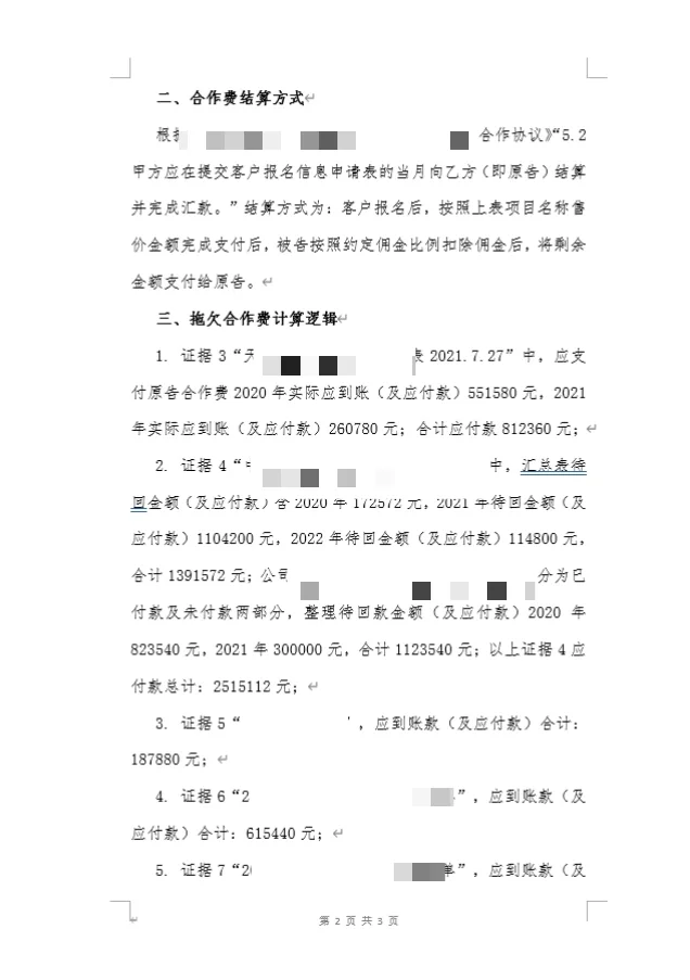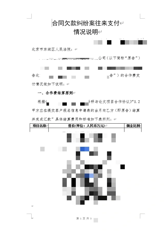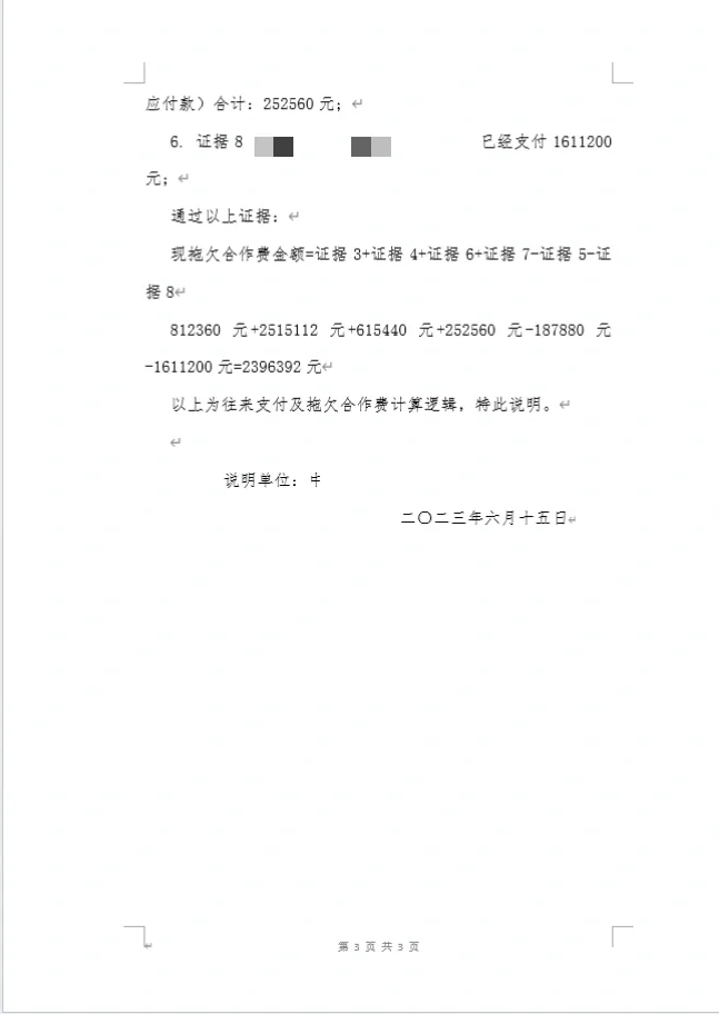 在这种情况下,合同本身并不复杂。甲方提供服务,乙方向甲方介绍客户后,甲方向乙方支付服务费。后因服务费逾期,乙方将甲方告上法庭。 这起案件的复杂性在于200多万未付服务费的具体计算。 交易的方法和过程是什么 每位客户的签约时间和服务费金额是多少 被告确认了吗 有对账单吗 被告对客户有异议吗 我们现在还在继续合作吗 记得当天开庭,向法院解释200多万元的数据,提供详细的计算和支持,并提交书面代理意见。几天后,法官再次联系我,通知我提交一份书面的“情况说明”(详见图3、图4和图5)。后来,法院判决书中的一些内容被直接复制粘贴到我的《情况说明》中。 在法律上选择了数学作为一门学科,但在实践中,它离不开数学和逻辑思维。 没关系,辛苦的工作没有白费,我们设法为当事人赢回了200多万元和利息。