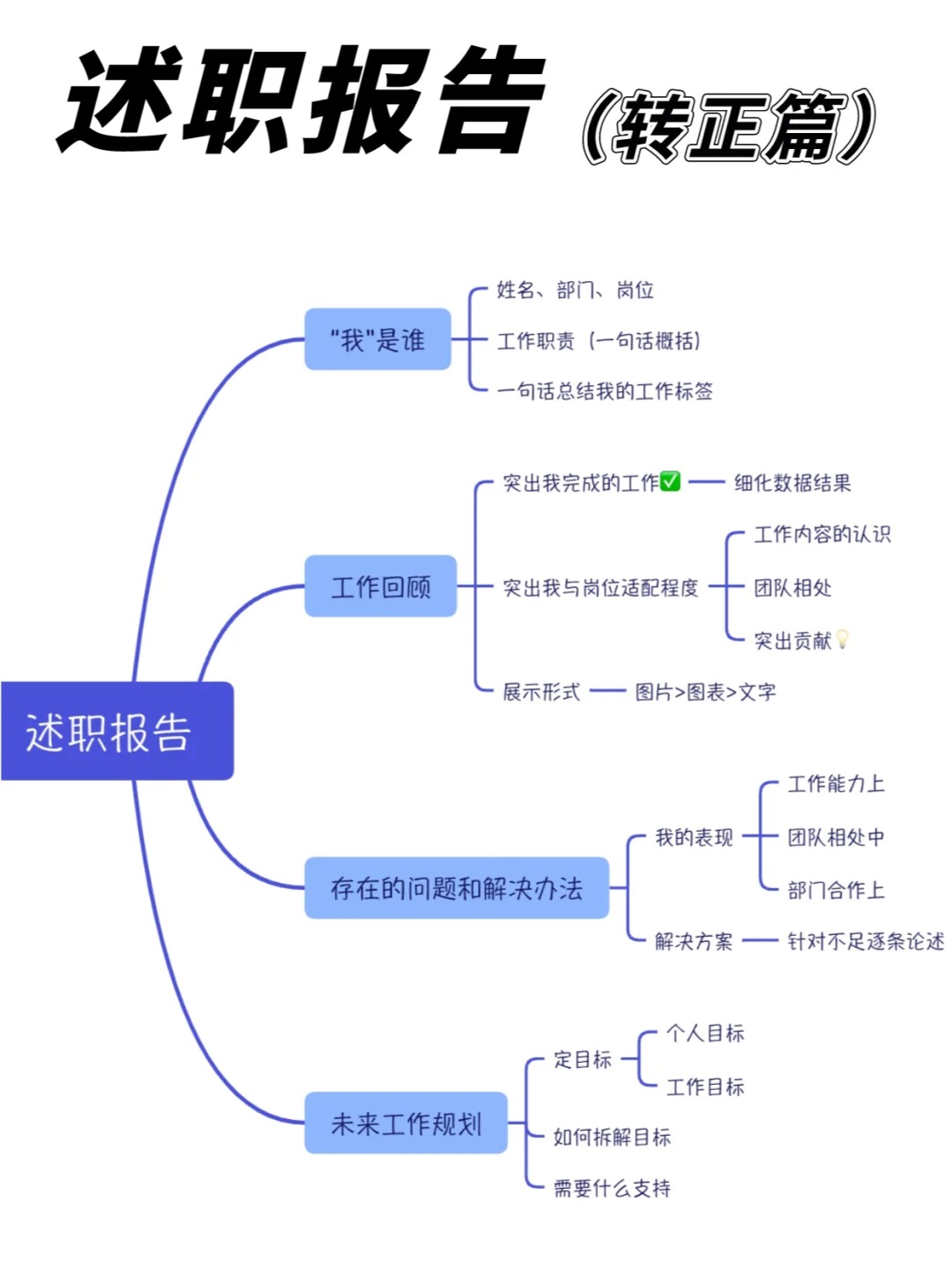 在大厂参加了几十次述职后,总结了这个述职模板。 原是想帮助团队里“只会干活不会把成绩讲出来”的同学,今天分享给大家,一起告别“只会干不会说”。 写述职报告的目的一般分三类,一是为了转正,二是为了升职,三是为了加薪。应用比较广的应该是转正类和升职用的,今天先给大家聊聊关于转正类的述职报告。 转正类的述职报告,要重点突出“我”与岗位的匹配程度,以及实习期间我对工作的认识和思考,尤其是在实习期间有杰出贡献的,一定要重点展示出来。述职报告除了展示你的适应能力外,也是第一次与大领导面对面的机会,一定要给领导留一个好印象,让他能在短短的几分钟内记住你。 很多人会觉得述职报告和年终总结有很多相似的地方,两个是不是一回事儿,这样想就错了。述职报告一般是刚入职期间的,短的也就是一个月,长也不回超过6个月,所以这个时候你的思考和认识是比较浅的,更多的是突出你的学习能力和工作能力,而年终总结更多是对全年工作的一个总结,突出的是工作效果。 述职报告结束后,一般会围绕你的述职里的项目和你的认识有提问,这个也可以提前准备下,回答要有逻辑性,一般都没有什么准确答案,言之有理即可。 这里大致举个例子给大家看看: 一、业绩回顾 用好金字塔原理,结论先行,先讲成果 1.基础信息 重点介绍自己所在的业务线和岗位职责。 2.工作回顾 重点介绍过去一年做了哪些工作,取得了什么样的成绩,给公司创造了哪些价值。 二、核心项目复盘 用项目复盘法,不成功的项目也能讲出彩 1.项目选择 重要性:公司重点项目或领导关心的项目; 能讲得出彩:有故事可讲的项目; 完成度:拿到不错结果的项目。 2.项目描述 用STAR模型(Situation-Task-Action-Result),把项目讲得出彩。 3.项目复盘 讲收获:有哪些指标增长了;有哪些流程被优化了 讲问题:项目过程中遇到了哪些问题,你打算如何解决这些问题 三、个人成长 多讲讲自己的成长吧,谁都喜欢不断成长的人 1.过去一年的工作中,我在以下几个方面得到了锻炼:... 2.我把过去一年的经历,总结沉淀成几个方法论:... 四、未来展望 不被老板画饼最好的方式是:给老板画个饼 1.工作目标 未来一年,结合团队的目标,你的工作目标是什么? 2.目标实现节奏 用鱼骨图展示每个季度的目标和关键事项 当然一些比较害羞内敛的同学尽管在过去的时间里取得了非常多的成果,但苦于文笔不行,写出来的报告总感觉枯燥,没能完全展示自己,这时候你就需要一个专业团队的帮助了。 欢迎联系我们,专业团队,10以上的述职竞聘报告经验,从0开始帮您完成报告,助您成为领导面前最棒的员工。