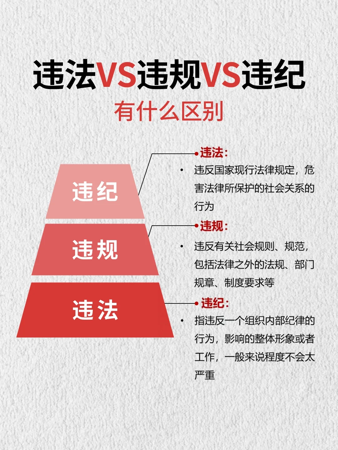 许多不懂法律的人不知道,仅仅一个词是完全不同的。今天,让我们普及一下基本的法律知识,并区分一些问题 罪犯管理司法拘留 它们在法律依据、适用对象、税务机关、拘留期和法律后果方面有所不同,如上表所示,更便于用户使用。 不合法的违反违反纪律 不合法的 违反现行国家法律法规,危险 有害于受法律保护的社会关系 违反 违反相关社会规则和规范,包括法规和法律之外的部门 法规、制度要求等 违纪:是指违反组织内部纪律,影响整体形象或工作,严重程度一般不太严重的行为 不合法的罪行 什么是违法的 违法是指所有违反宪法、法律、行政法规和我国规则的行为,具有广泛的外延。 什么是犯罪 犯罪是指违反我国刑法规定的行为。这是一种更严重的违法行为。 不合法的罪行 违法是一个相对较大的概念,而犯罪是一个比较小的概念。一种行为可能是非法的,但并不涉及犯罪,比如简单地闯红灯。但是,如果一种行为被视为犯罪,那么它一定是非法的。 可以得出的结论是,犯罪始终是违法行为,但违法行为不一定是犯罪行为。 这些概念需要澄清。如果你有什么不明白的地方,可以一起交流