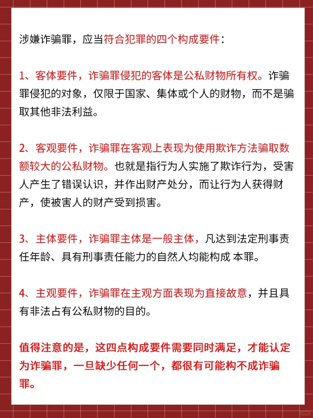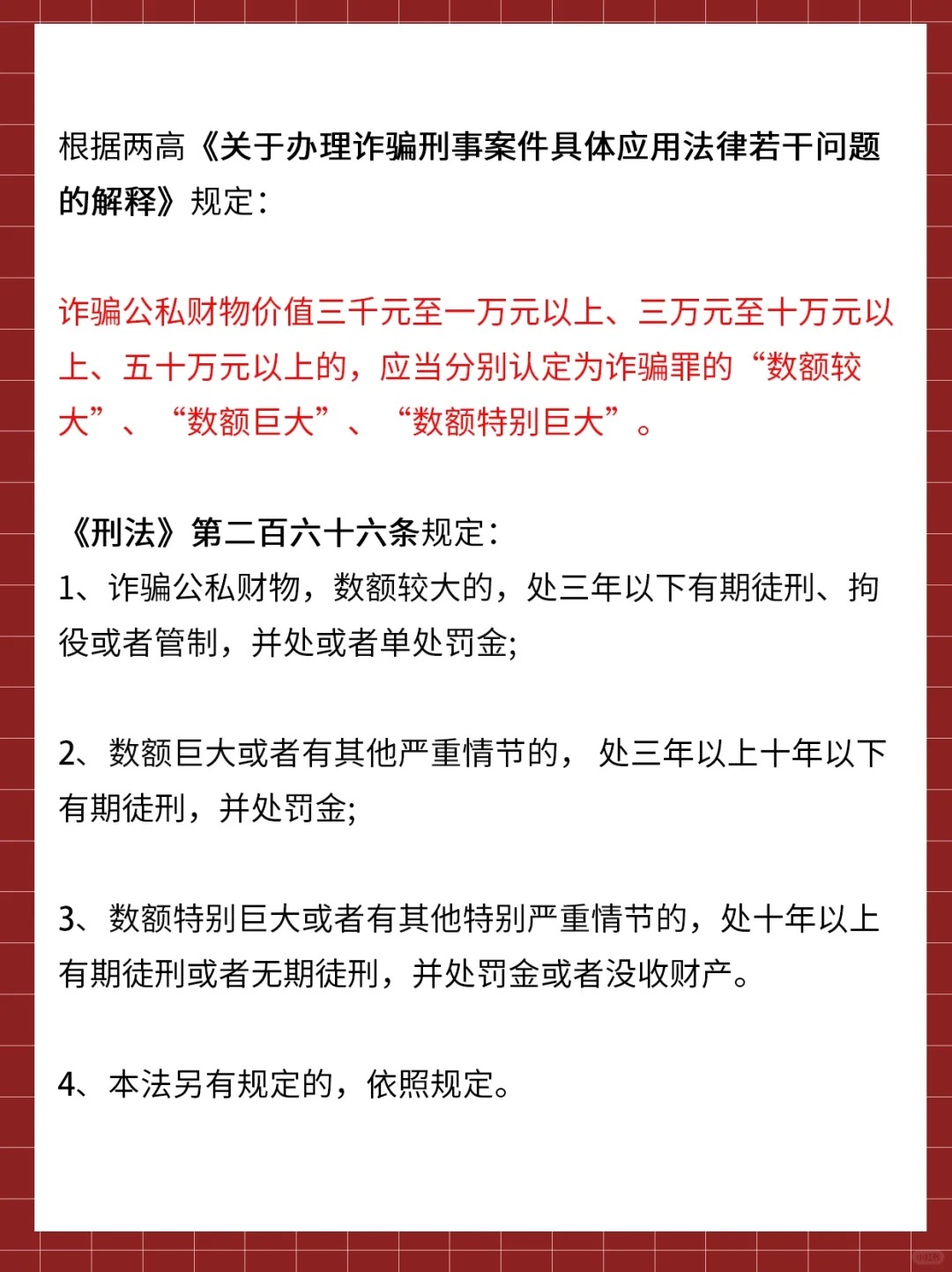 首先,涉嫌诈骗需要满足诈骗罪的各个标准,因为涉嫌诈骗具体量刑是根据实际情况来决定的,比如说犯罪情节、主观程度、从轻情节等来决定的。涉嫌诈骗罪,应当符合犯罪的四个构成要件: 1.客体要件,诈骗罪侵犯的客体是公私财物所有权。诈骗罪侵犯的对象,仅限于国家、集体或个人的财物,而不是骗取其他非法利益。 2.客观要件,诈骗罪在客观上表现为使用欺诈方法骗取数额较大的公私财物。也就是指行为人实施了欺诈行为,受害人产生了错误认识,并作出财产处分,而让行为人获得财产,使被害人的财产受到损害。 3.主体要件,诈骗罪主体是一般主体,凡达到法定刑事责任年龄、具有刑事责任能力的自然人均能构成 本罪。 4.主观要件,诈骗罪在主观方面表现为直接故意,并且具有非法占有公私财物的目的。 值得注意的是,以上这四点构成要件需要同时满足,才能认定为诈骗罪,一旦缺少任何一个,都很有可能构不成诈骗罪。 根据两高《关于办理诈骗刑事案件具体应用法律若干问题的解释》规定: 诈骗公私财物价值三千元至一万元以上、三万元至十万元以上、五十万元以上的,应当分别认定为诈骗罪的“数额较大”、“数额巨大”、“数额特别巨大”。 《刑法》第二百六十六条规定 诈骗公私财物,数额较大的,处三年以下有期徒刑、拘役或者管制,并处或者单处罚金; 数额巨大或者有其他严重情节的, 处三年以上十年以下有期徒刑,并处罚金; 数额特别巨大或者有其他特别严重情节的,处十年以上有期徒刑或者无期徒刑,并处罚金或者没收财产。 本法另有规定的,依照规定。 如果你有类似的法律问题需要帮助,欢迎随时联系我们。