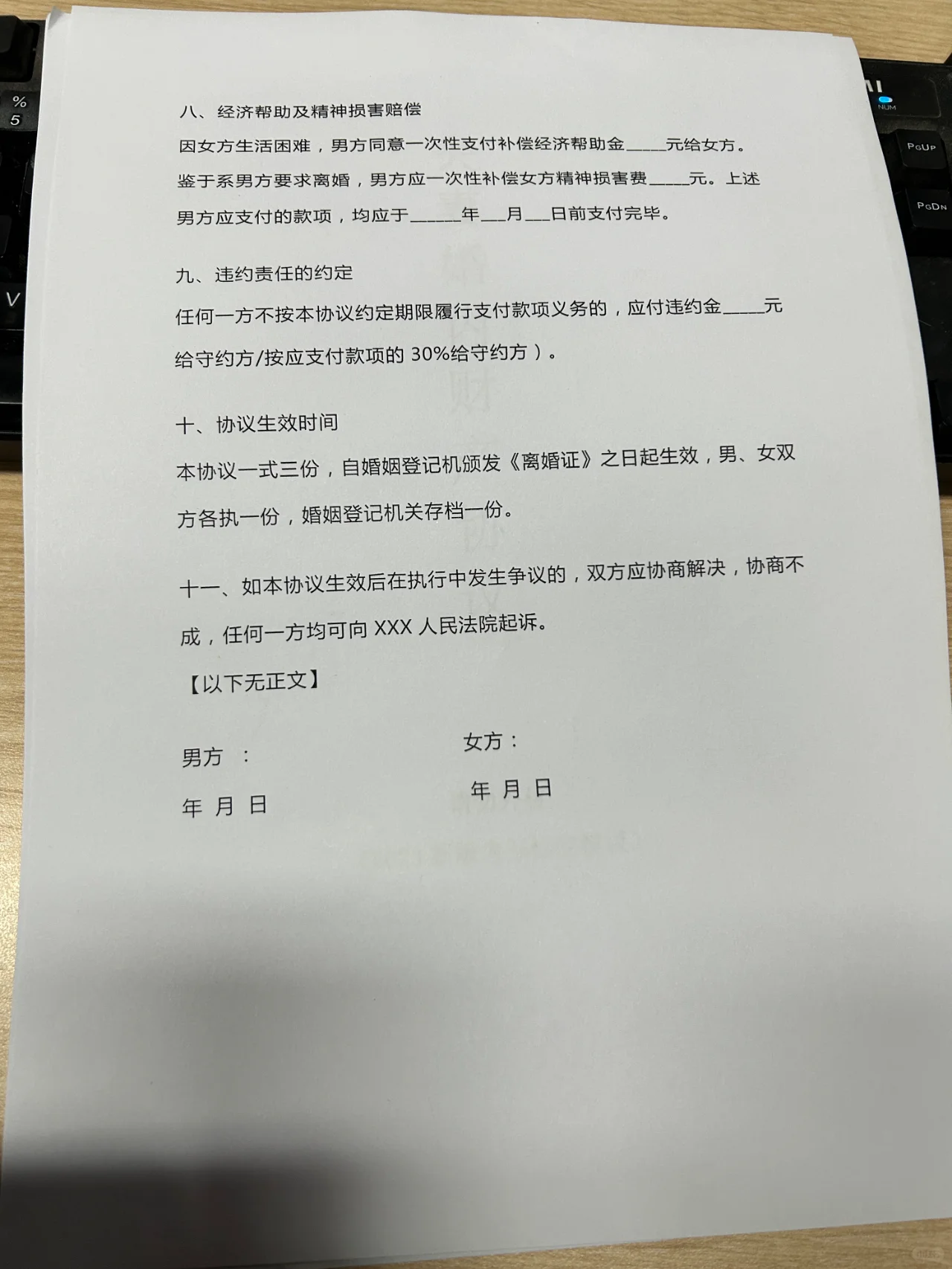 离婚协议书书写范本超完整!分享《离婚协议书》模版图1-4有利于女方保护财产孩子的离婚协议 注意事项: 户口纠纷不属于法院的受理范围,公安机关也无权干涉。而涉及一方或孩子户口迁移,必须要双方配合提供户口本原件及相关证件。因此应在协议中写明不迁出户口或者不配合办理手续的法律责任,来约束当事人。 关于抚养费的约定 如果双方不作特别约定,根据法律规定,抚养费包括生活费、教育费和医疗费三项。建议双方约定每月支付一定金额的生活费,且逐年递增(约定具体的比例),教育费、医疗费和大笔开支(如子女须对外承担责任)则按照实际发生金额,由双方平均分担。 如果你不知道协议怎么写,或者拿不准这么写规不规范、会不会生效时,可以委托婚姻律师代写,为自己离婚后的生活设立一份真正的保障️ 如果你需要代写协议或者离婚需要律师起诉的 这边可以 推~荐专业靠谱的婚姻律师帮忙
