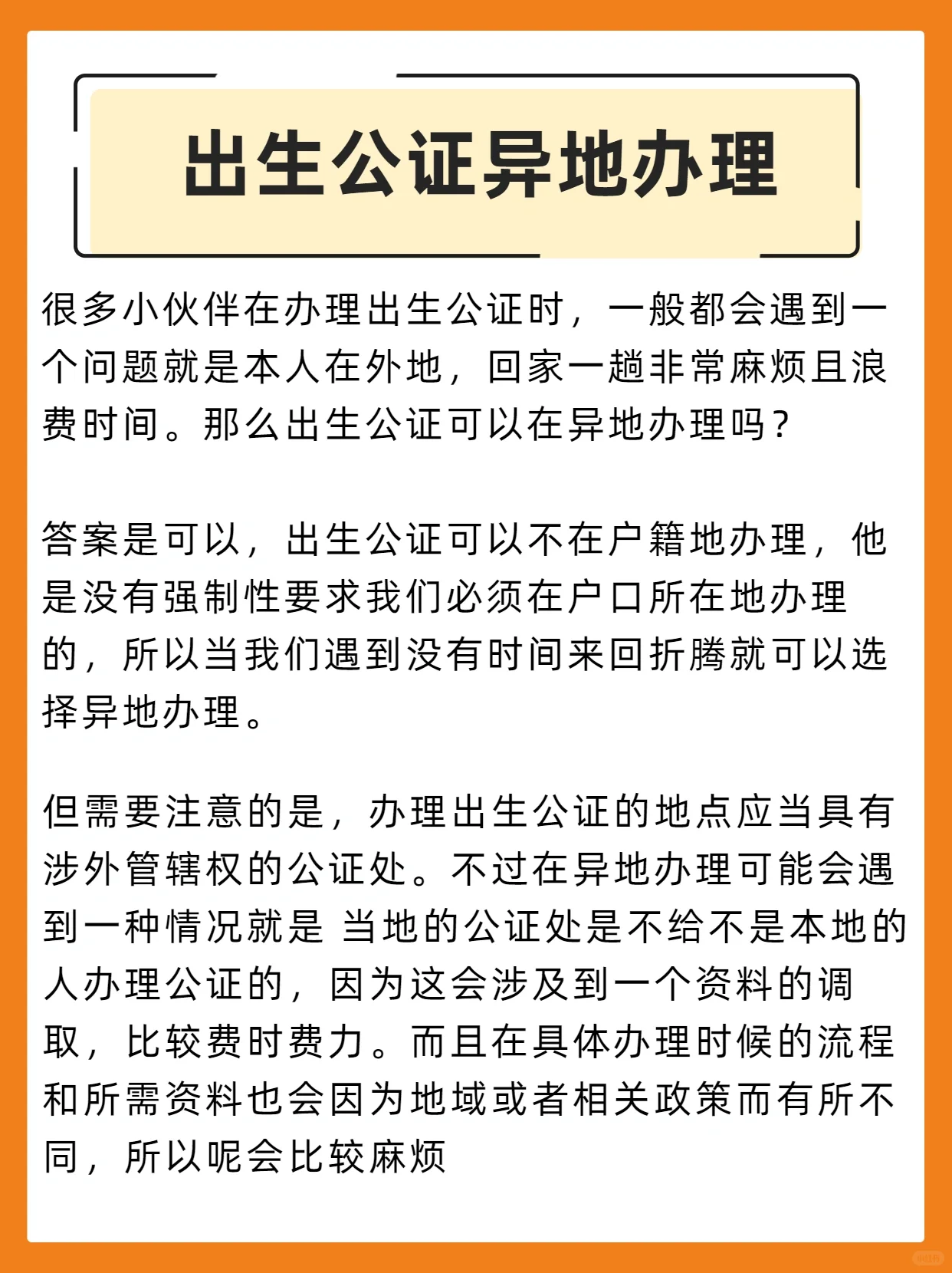但需要注意的是,办理出生公证的地点应当具有涉外管辖权的公证处。不过在异地办理可能会遇到一种情况就是 当地的公证处是不给不是本地的人办理公证的,因为这会涉及到一个资料的调取,比较费时费力。而且在具体办理时候的流程和所需资料也会因为地域或者相关政策而有所不同,所以呢会比较麻烦
