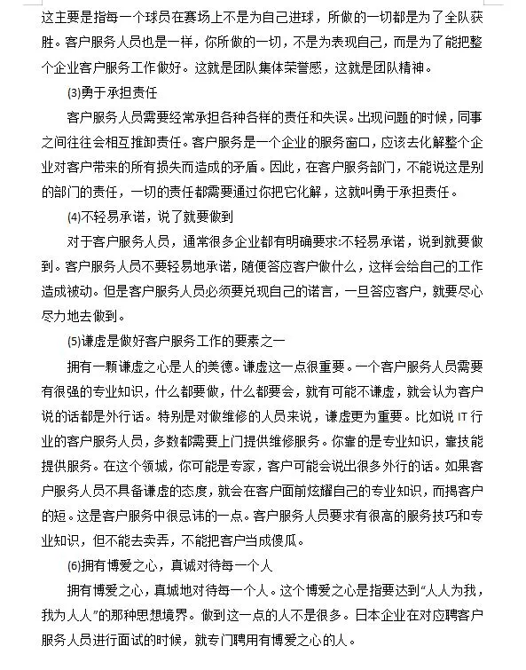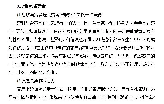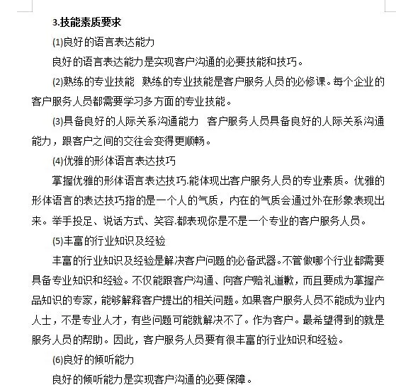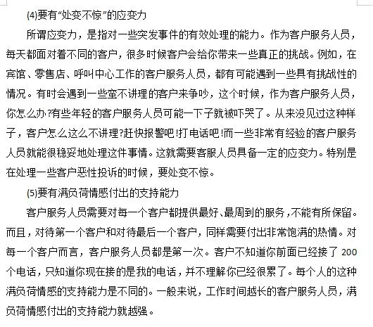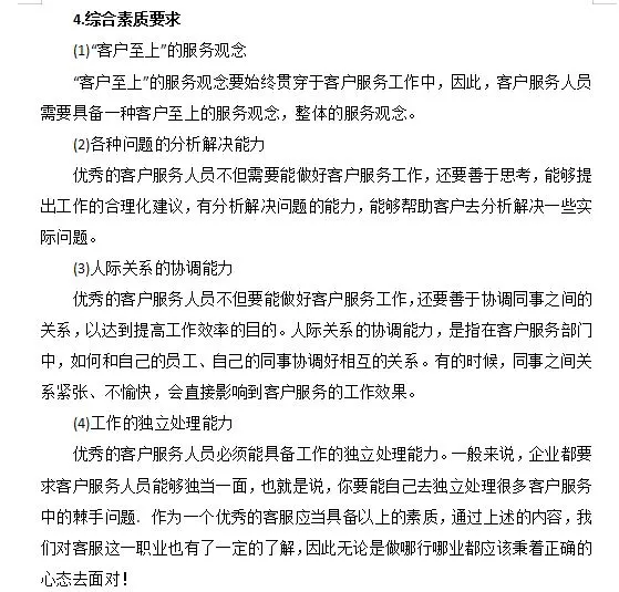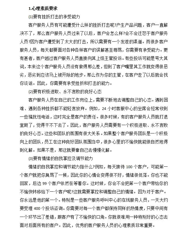 1.心理素质要求 (1) 有能力承受挫折和挫折 客服人员可能会遭受什么样的挫折当产品出现问题而无法解决时,客户会发生什么这会被归咎于客服人员吗因为客户受到了太多的伤害,所以需要有一个发泄的渠道。许多客服人员每天都面临来自客户的各种误解甚至侮辱,你需要有能力处理它们。更糟糕的是,客户可以绕过客服人员直接向上级投诉。有些抱怨可能被夸大了。本来这位客服代表做得并不是那么差,但是当客户抱怨他们的工作时,情况变得非常糟糕,糟糕到他们应该立即被解雇。因此,作为您的主管,我们将在客户离开后与您交谈。因此,你需要有承受挫折和挫折的能力。 (2) 保持积极的态度,永不放弃 客户服务人员需要在工作岗位上不断调整自己的心态。当遇到困难和各种挫折时,不要轻易放弃。例如,24小时客服中心经常接到骚扰电话,这完全是客户的责任。很多时候,一些客户服务代表放弃了,觉得他们无法继续。因此,客户服务人员需要有一个积极的,永不放弃的态度。这些都与球队的氛围密切相关。如果整个客服团队是一个积极向上的团队,那么员工在这种良好的团队氛围中的许多不愉快情绪就可以自然而然地得到解决。如果没有,那就由你自己慢慢解决了。 (3) 具有控制和调节情绪的能力 自我控制和调节情绪的能力指的是什么例如,如果你每天接待100位顾客,第一位顾客可能会大骂你,导致你的情绪变得非常糟糕和低落。你也不能回家,还有99个客户在等你。在这一点上,你会把第一个客户带来的不愉快体验转移到下一个客户身上吗这需要控制和调整自己的情绪。因为对于客户而言。你永远是他的第一个。特别是对于客户服务呼叫中心的一些在线服务人员来说,他们每天处理大约400起投诉和咨询。你需要对每个客户保持同样的热情,只要其中一个环节有错误,并且与客户发生了令人不快的争吵。你很难以一种特别好的心态面对身后的所有客户。因此,优秀客服人员的心理素质是非常重要的。