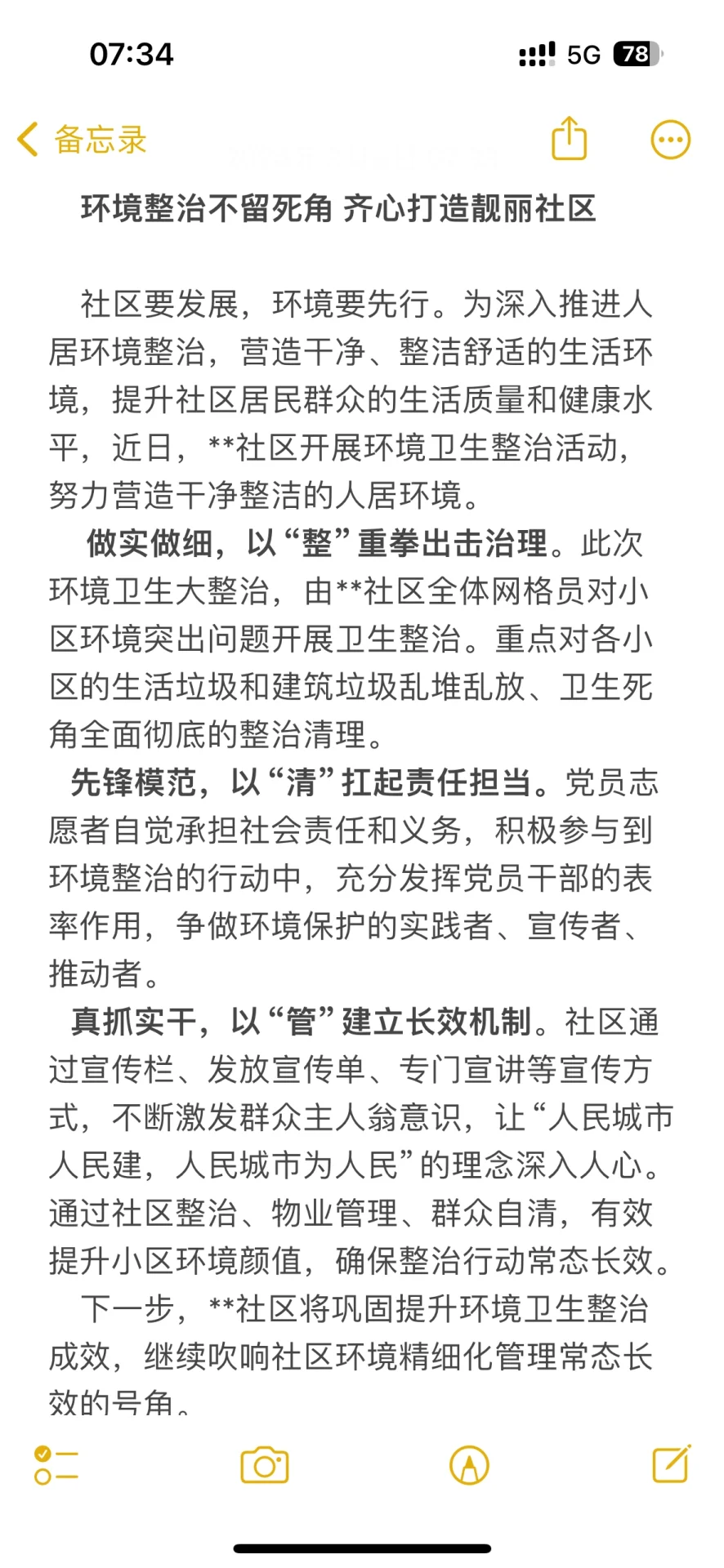 缝补另一件东西,总有一件可以用 环境整治不留死角,携手打造美丽社区 社区需要发展,环境需要优先考虑。为深化人居环境整治,营造干净、整洁、舒适的人居环境,提高社区居民的生活质量和健康水平,支那社区日前开展环境卫生整治活动,努力营造干净整洁的人居环境。 务实细致,用“全”的办法治理。此次环境卫生大整治将由**社区所有网格员共同开展,解决社区突出的环境问题。采取重点措施,全面彻底清理乱倒生活垃圾和建筑垃圾,以及每个居民区的卫生死角。 先锋模范,以“清晰”肩负责任。党员志愿者自觉承担社会责任和义务,积极参与环境整治行动,充分发挥党员干部的表率作用,努力成为环境保护的践行者、宣传者、推动者。 应努力通过有效管理建立长期机制。社区通过宣传栏、发放传单、专题讲座等宣传方式,不断激发群众的主人翁意识,让“人民城市、人民城市”的理念深入人心。通过社区整治、物业管理、群众自洁,有效提升社区环境的审美价值,确保整治行动的长效性。 下一步,社区将巩固提升环境卫生整治成效,继续吹响社区环境长期常态化精细化管理的号角。