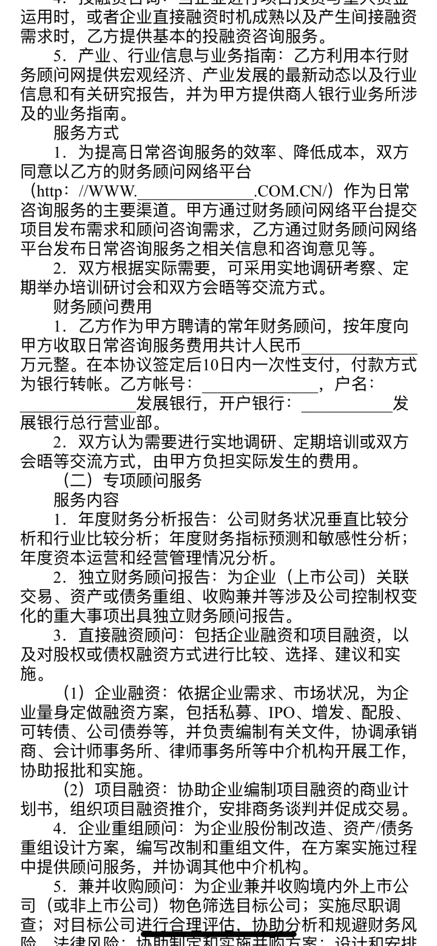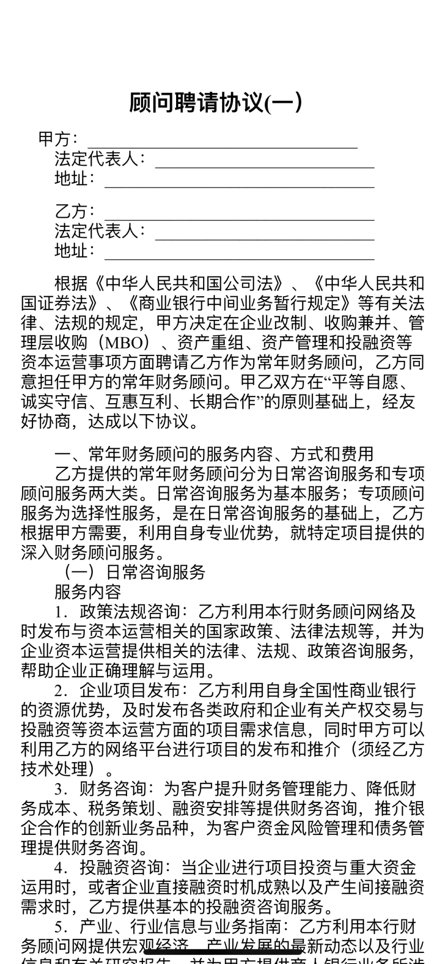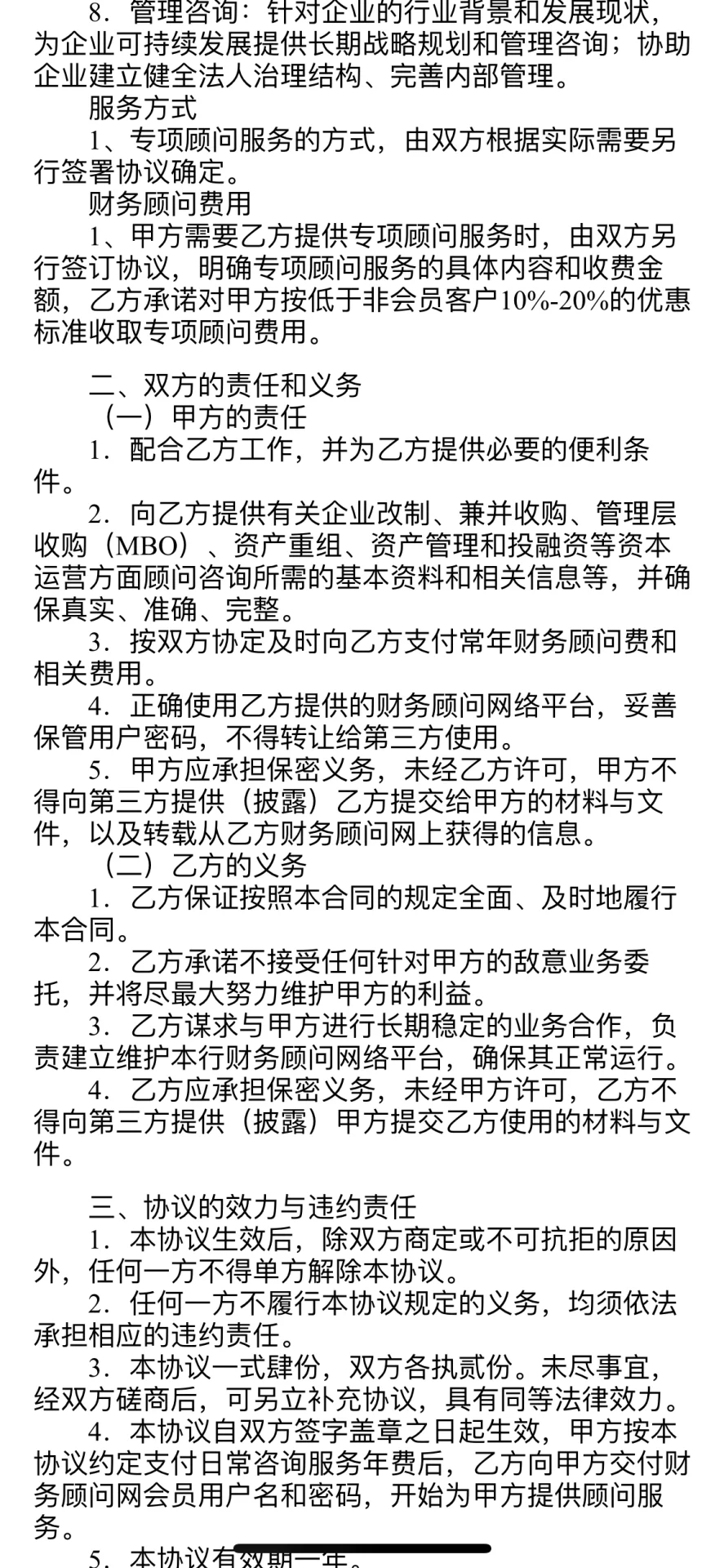 今天,我来给大家分享一个看似普通,实则关乎个人利益的职场知识点——顾问雇佣协议。为什么这个协议如此重要 寿贤,顾问聘用协议是企业与顾问之间的“法律合同”,明确了双方的权利和义务。该协议就像一把保护伞,确保合作过程中的权益不受侵犯,无论是对企业还是个人,避免在发生纠纷时出现“毫无根据的索赔”。 在协议中,通常包括以下核心要素: 雇佣条款和条件:明确规定服务范围、工作职责和完成标准。 工资和支付方式:具体金额、支付期限、可能的奖金、福利等。 保密条款与竞业禁止:防止商业秘密泄露,维护企业竞争优势。 违约责任:明确违约时应承担的责任和赔偿措施。 签署顾问任命协议不仅可以让双方按照协议行事,还可以在出现问题时提供法律依据。尤其是对于自由职业者或职业顾问来说,它是你的盔甲,让你的工作更安全 总结 法律顾问协议是每一个专业合作伙伴关系的基石,不仅需要签署,还需要明确、充分地签署。签字时一定要仔细阅读所有条款和条件。如果你有任何问题,你可以寻求专业法律专业人士的帮助,使协议真正成为你职业道路上的“守护天使”。