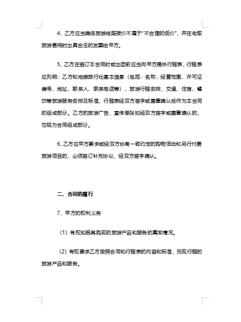 起草国内旅游集团合同协议有哪些秘密,让您的旅行团更加可靠! 大家好,我是你们的小红书法与法律博主。今天小编就和大家聊一聊国内旅游组团合同协议起草的要点!你想要一个愉快和安全的旅行体验吗你一定不能错过这个充满宝贵信息的分享! 要点一:明确双方信息和群组细节 在合同开始时,应明确列出甲方(旅行社)和乙方(游客)的基本信息,以确保双方身份清楚。接下来,详细描述旅游团的详细情况,包括团名、出发日期、返回日期、行程安排等,让游客对整个行程有一个全面的了解。 要点2:成本明细和付款方式 合同必须详细说明旅游费用,包括团费、门票费、餐饮费、住宿费等,以确保游客对每笔费用的目的地有清楚的了解。另外,请说明付款方式,是全额付款还是分期付款它应该写得清楚,以避免在后期发生争议。 要点三:服务标准和质量保证 在合同中明确规定旅行社提供的服务标准,如导游的资质和经验、车辆的舒适性和安全性、住宿条件等。同时,它强调旅行社对服务质量的承诺,确保游客在旅行中享受高质量的服务。 要点四:退改政策与违约责任 提供详细的往返政策清单,包括条件、费用等,为游客调整行程提供明确依据。同时,明确双方的违约责任。旅行社未按约定提供服务,或者游客未按时赴约的,必须有明确的违约责任条款。 要点五:保险和安全保护 在合同中,明确旅行社为游客购买的保险类型和金额,使他们在旅行中更有安全感。同时,它强调旅行社的安全措施,如应急计划、紧急联系方式等,以确保游客在发生紧急情况时能够得到及时有效的帮助。 要点六:争议解决方法 不要忘记在合同中规定争议解决方法,如谈判、调解或诉讼。这样,当双方发生争端时,可以迅速找到解决方案,避免冲突升级。 提示:在起草合同时,必须遵守相关法律、法规和行业规范,以确保合同内容合法合规。同时,建议聘请专业律师对合同进行审查,确保所有条款严格完整。 好了,今天的分享就到这里啦!希望这些要点能帮助您起草一份安全可靠的国内旅游团协议,让您的旅行更加愉快和放心!记得喜欢吗最喜欢的是什么哦,下次你需要的时候可以很快找到它!