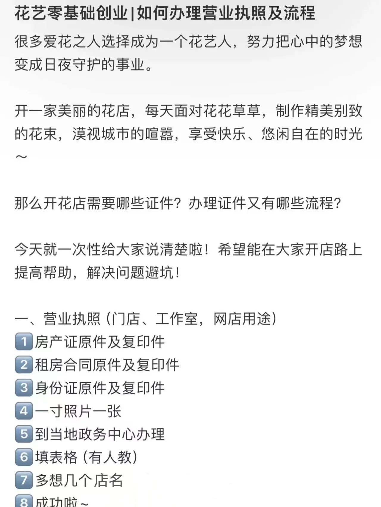 很多爱花之人选择成为一个花艺人,努力把心中的梦想变成日夜守护的事业。 开一家美丽的花店,每天面对花花草草,制作精美别致的花束,漠视城市的喧嚣,享受快乐、悠闲自在的时光~ 那么开花店需要哪些证件办理证件又有哪些流程 今天就一次性给大家说清楚啦!希望能在大家开店路上 提高帮助,解决问题避坑! 一、营业执照(门店、工作室,网店用途) 1.房产证原件及复印件 2.租房合同原件及复印件 3.身份证原件及复印件 4.一寸照片一张 5.到当地政务中心办理 6.填表格(有人教) 7.多想几个店名,以免重名。 8.成功啦~ 9.拿证时间:工作日一周 10.然后去税务登记 敲黑板!! 代办营业执照,需要提供委托书、身份证复印件、委托代理人身份证及复印件。 工作室如果接到企业订单,对方要求开发票的情况下,就需要先办理营业执照→税务登记→开通电子发票功 能。 二、税务登记(开发票用的) 1.营业执照 2.提前备公章,税务章(某宝,提供营业执照) 3.去当地税务机关办理 4.填表(当天就能完成) 5.开通好就可以直接在税务系统开电子发票啦 如果实在不懂,欢迎随时联系我们~