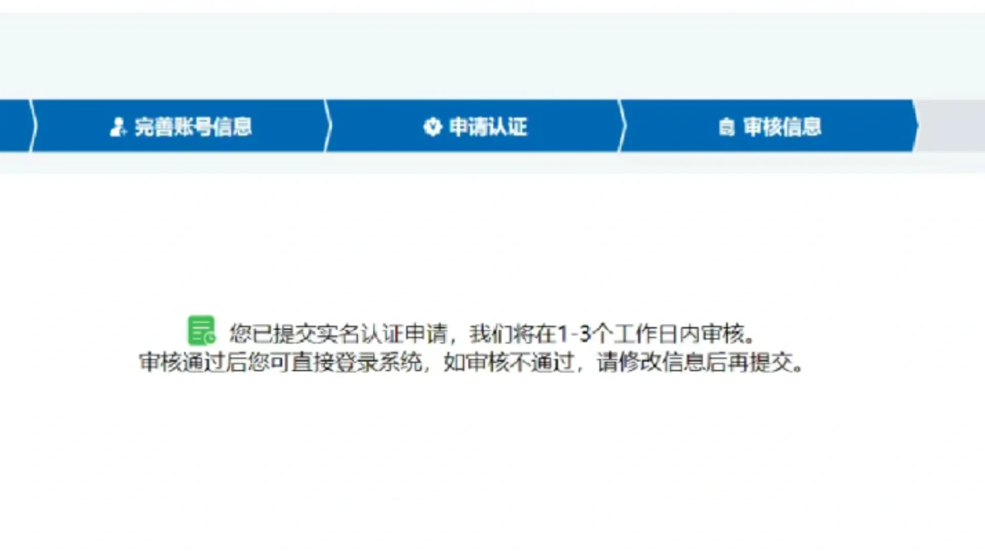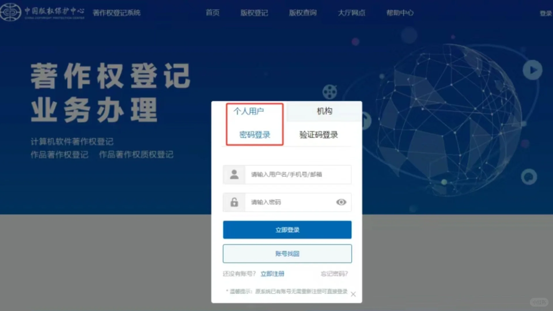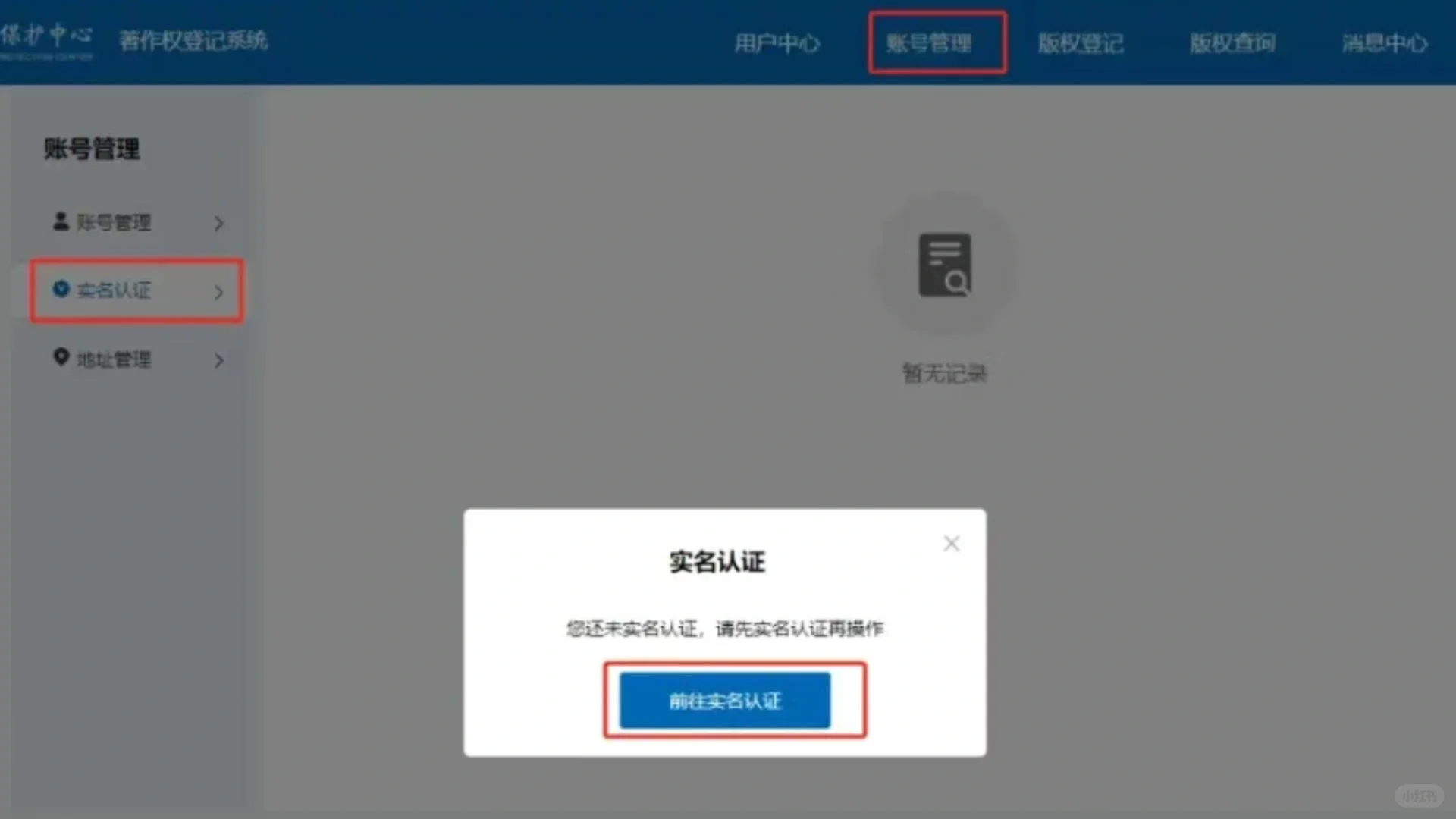 1、 材料准备 个人:1。身份证正面和背面的扫描件;2.我拿着我的身份证照片(身份证信息不能被遮挡) 企业:1。营业执照扫描件;2.负责人的姓名、电话和电子邮件地址;3、经办人身份证正反面扫描件;4.企业授权书扫描件(需加盖公章) 2、 实名认证周期 1-3个工作日 3、 具体操作步骤(个人) 登录版权办公室,单击“同意”并继续 创建帐户时,需要注意的是,一个电话号码只能使用一次,不能多次使用。输入帐户信息后,手机将收到一个验证码。在输入验证码和其他帐户信息后,注册即告完成。 点击注册 登录-选择个人用户-密码登录,输入注册信息登录 点击用户中心-账户管理-实名认证-进入实名认证 填写电子邮件-发送验证码-填写验证码-点击提交并实名继续 完善实名认证信息,上传身份证正面和背面照片,以及持有身份证的照片 点击提交以供审查