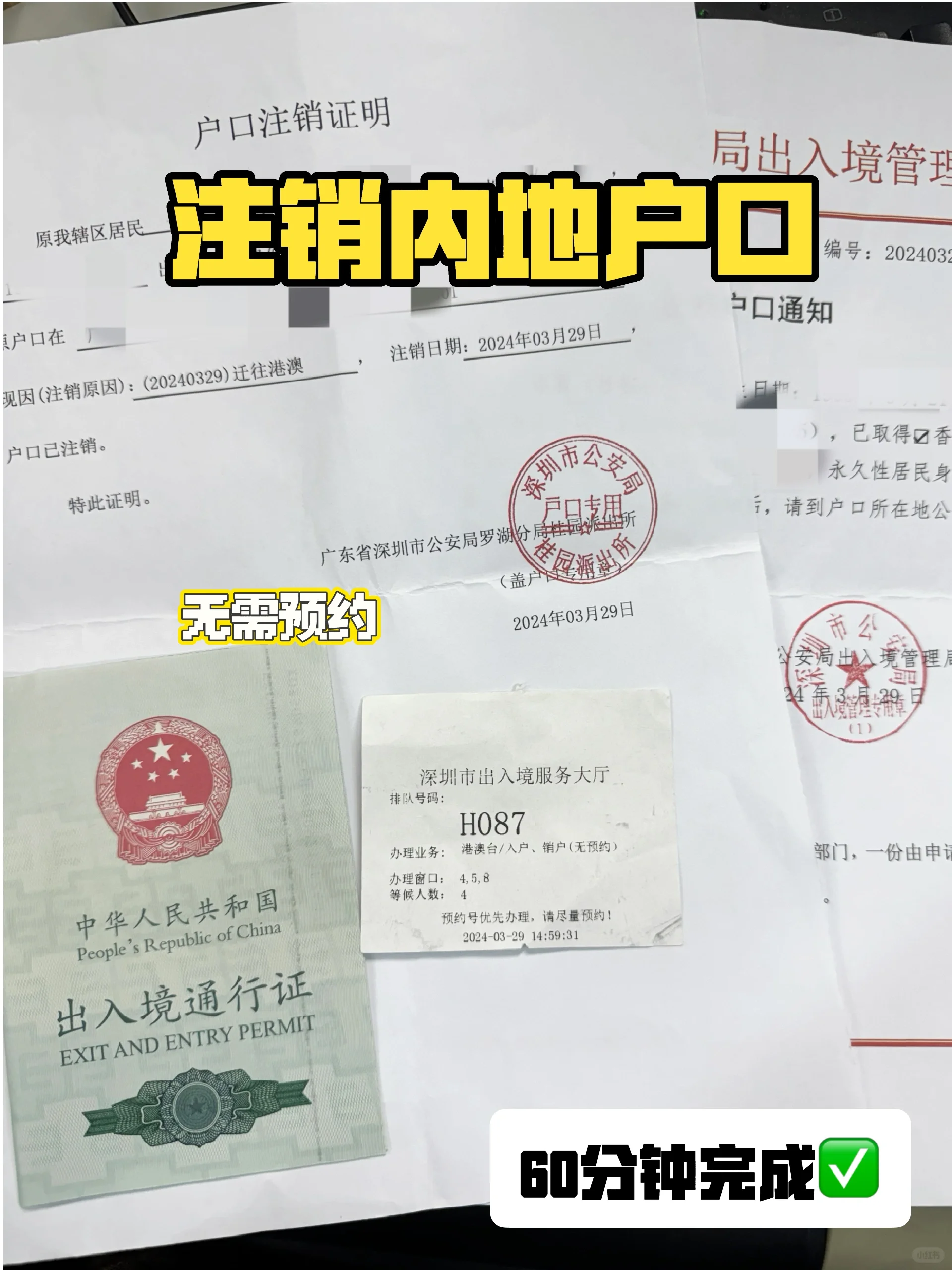 一地办理注销内地户口!不需要跑派出所! 先在深圳市公安局网上申请注销户口,需要上传港澳通行证和香港身份证,等大概3.个工作天短信通知确认申请成功,就可以携带以下证件原件到深圳市公安局出入境管理局办理业务. 地址:深圳市罗湖区解放路4016号 现场拿号,无需预约,深圳办事效率很高,我去的时候前面有4.个号,排了20分钟就到了. 准备资料: 1.️内地身份证 2.️香港永居身份 3.️户口本 4.️港澳通行证 5.️护照 6.️香港入境处的注销通知书 7.️2.寸蓝底照片带回执(现场拍) 当场拿到《注销户口通知书》,这一步会剪掉通行证护照,销户就完成了。然后到最后一个窗口,等叫名字拿《户口注销证明》,然后返回咨询台填表,拿号,办理一次性通行证。 准备资料: 1.️一次性通行证申请表 2.️《户口注销证明》和香港身份证正反面复印件,办事处有打印机,免费使用,不需要提前准备 3.️直走最里面有个拍照区,拿完号排队的时间就可以先去拍照,蓝底照片带回执 一次性通行证要三个工作天,办理当天不计。请大家安排好时间