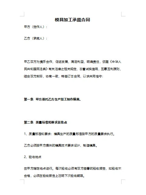 起草模具加工合同的要点,一目了然! 明确双方的身份和基本信息 首先,我们需要澄清合同双方的身份和基本信息。甲方(委托方)和乙方(承包方)的全名、地址和联系方式应写清楚,这有利于双方的沟通和沟通,并为未来的合作奠定坚实的基础。 模具信息详细说明 在合同中,有关模具的信息可以清楚地描述。模具的名称、规格、数量、材质、精度要求等必须一一列出。这些信息是承包商生产模具的基础,也是确保模具质量的关键。 约定的处理截止日期和交付时间 在承包合同中,加工期和交货时间是影响双方利益的重要事项。我们需要明确约定模具的生产周期和交付日期,以确保乙方能够按时完成模具生产,甲方也可以按照计划使用模具。 费用和支付方式 成本问题是合同的亮点!我们需要明确约定模具的加工成本、材料成本、运输成本和其他费用,并注明付款方式和时间。记得写清楚,以免日后发生费用纠纷。 质量标准和验收方法 为了确保模具的质量符合双方的协议,我们需要在合同中规定质量标准、验收方法和不合格产品的处理方法。这样,乙方可以按照标准生产,甲方也可以对模具的质量有明确的判断标准。 保密和知识产权条款 在模具制造过程中,双方都可能涉及敏感信息和技术秘密。因此,保密和知识产权条款至关重要。我们需要明确约定双方对信息的保密义务,以及知识产权的所有权和使用权,以避免未来发生争议。 售后服务和技术支持 一个好的模具不仅在生产后完成,对后续的售后服务和技术支持也很重要。我们可以在合同中规定,乙方应提供一定期限的售后服务和技术支持,以确保甲方能够及时解决使用过程中遇到的任何问题。 违约责任及争议解决方法 当然,为了保证合同的顺利履行,我们还需要就违约责任和解决纠纷的方法达成一致。例如,如果一方违约,该怎么办如何解决双方之间的纠纷这些必须在合同中明确说明。 温馨提醒 在起草合同时,建议双方进行深入沟通,明确对方的需求和期望。这样可以避免在后续合作中出现不必要的误解和纠纷。同时,如果条件允许,最好聘请专业的法律顾问对合同进行审查和修改,以确保合同的合法性和有效性。 好了,以上就是起草模具加工合同的要点!我希望这些秘密能帮助到每个人,让你的模具加工和承包之旅更顺利、更放心!