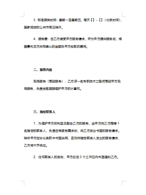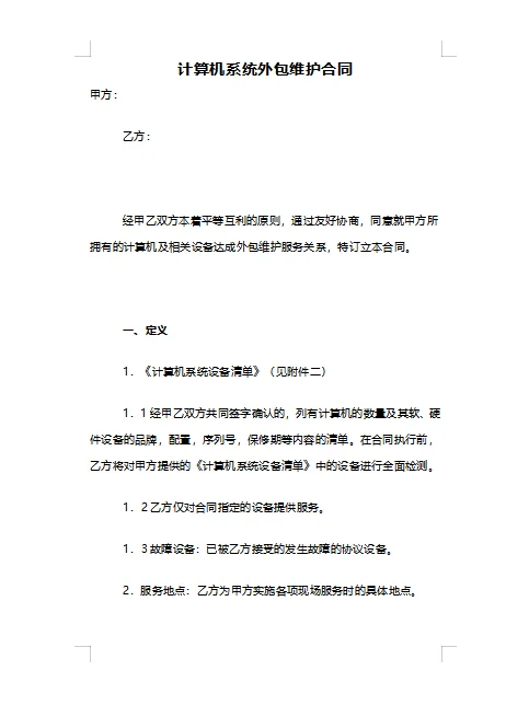 起草计算机系统外包维护合同的秘密,技术新手也能理解! 大家好!今天,我将与大家分享起草计算机系统外包维护合同的要点。在这个数字时代,计算机系统的稳定运行对企业和个人都至关重要。外包维护服务已成为保证系统稳定运行的有力助手。那么,如何起草一份专业实用的计算机系统外包维护合同呢来和我一起看一看! 要点一:明确服务范围和标准 在合同开始时,应明确列出外包维护服务的具体内容,包括系统检查、故障处理、数据备份等。同时,明确服务标准,如响应时间、解决率等,以确保双方对服务内容有清晰的了解。 要点2:约定服务期限和费用 合同应明确规定服务期,服务期可以是固定的,也可以按项目结算。同时,提供详细的服务费和支付方式清单,以避免将来因成本问题而产生争议。 要点三:明确双方的权利和义务 合同应提供双方权利和义务的详细清单。甲方有权享受约定的服务,并有义务提供必要的支持和协助;乙方有义务提供专业高效的服务,以确保甲方计算机系统的稳定运行。 要点四:保密条款 计算机系统往往涉及企业的核心数据和敏感信息,因此保密条款是合同中不可或缺的一部分。双方应明确约定保密义务,确保信息不被泄露或滥用。 要点五:违约责任与纠纷解决 在合同中明确违约责任和处罚措施,对任何违反合同约定的行为都应有明确的制裁措施。同时,应商定合理的争议解决方法,如谈判、调解或诉讼,以便在发生争议时迅速找到解决方案。 要点六:考虑特殊情况和附加条款 根据实际需要,可以在合同中增加附加条款。例如,在特定情况下(如系统升级、自然灾害等)同意服务调整或暂停;或者,可以商定具体的服务保障措施,例如提供备用设备或应急响应。 提示:在起草计算机系统外包维护合同时,必须遵守相关法律法规和行业规范,以确保合同内容合法合规。同时,建议聘请专业律师对合同进行审查,确保所有条款严格完整。