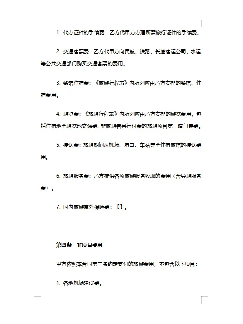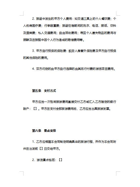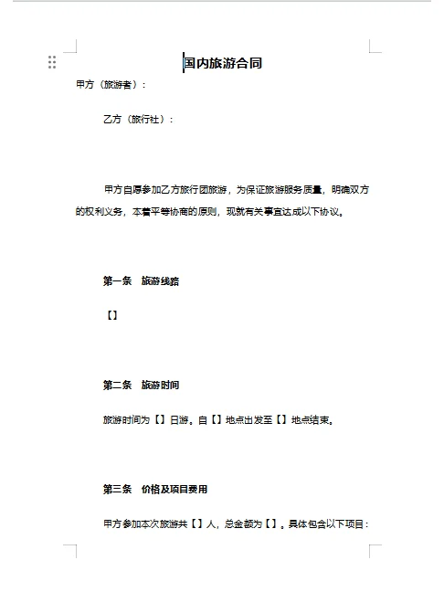 如何起草国内旅游合同协议,让您的旅行更加安心。 今天小编就和大家聊一聊国内旅游合同协议的起草要点!旅行是为了放松和享受美好时光,而可靠的旅行合同是保护我们权益的重要武器。快来看看! 要点一:明确双方信息和出行路线 在合同开始时,首先明确甲方(旅行社)和乙方(游客)的基本信息,包括姓名、地址、联系方式等。然后,提供旅游路线的详细描述,包括景点、行程安排、交通方式等,让游客对旅程有一个清晰的了解。 要点2:费用和支付方式 明确差旅费,包括团费、机票费、餐饮费、住宿费等,并注明支付方式。是全额付款还是分期付款所有内容都应该写清楚。同时,还应注意可能的额外费用,如自费项目、购物等,这些费用应在合同中明确说明。 要点三:服务质量和安全保证 合同应明确旅行社提供的服务质量标准,如导游资质、车辆安全、住宿条件等。同时,约定旅行社的安全措施,如应急预案、保险购买等,以确保游客在旅行过程中的安全。 要点四:退换货规定与违约责任 提供详细的返回和修改规定清单,包括条件、费用等,为游客调整行程提供明确依据。同时,明确双方的违约责任。旅行社未按约定提供服务,或者游客未按时赴约的,必须有明确的违约责任条款。 要点五:争议解决方法 最后,不要忘记包括争议解决方法。如果双方发生争议,我们应该选择谈判、调解还是诉讼应该事先达成一致,以便在出现问题时能够迅速解决。 提示:在起草合同时,一定要仔细阅读相关法律法规,确保合同内容合法合规。同时,还可以聘请专业律师帮助审查合同,避免出现任何漏洞。 好了,今天的分享就到这里啦!希望大家在中国旅游时能够签订一份安全可靠的合同,享受一段愉快的旅程!