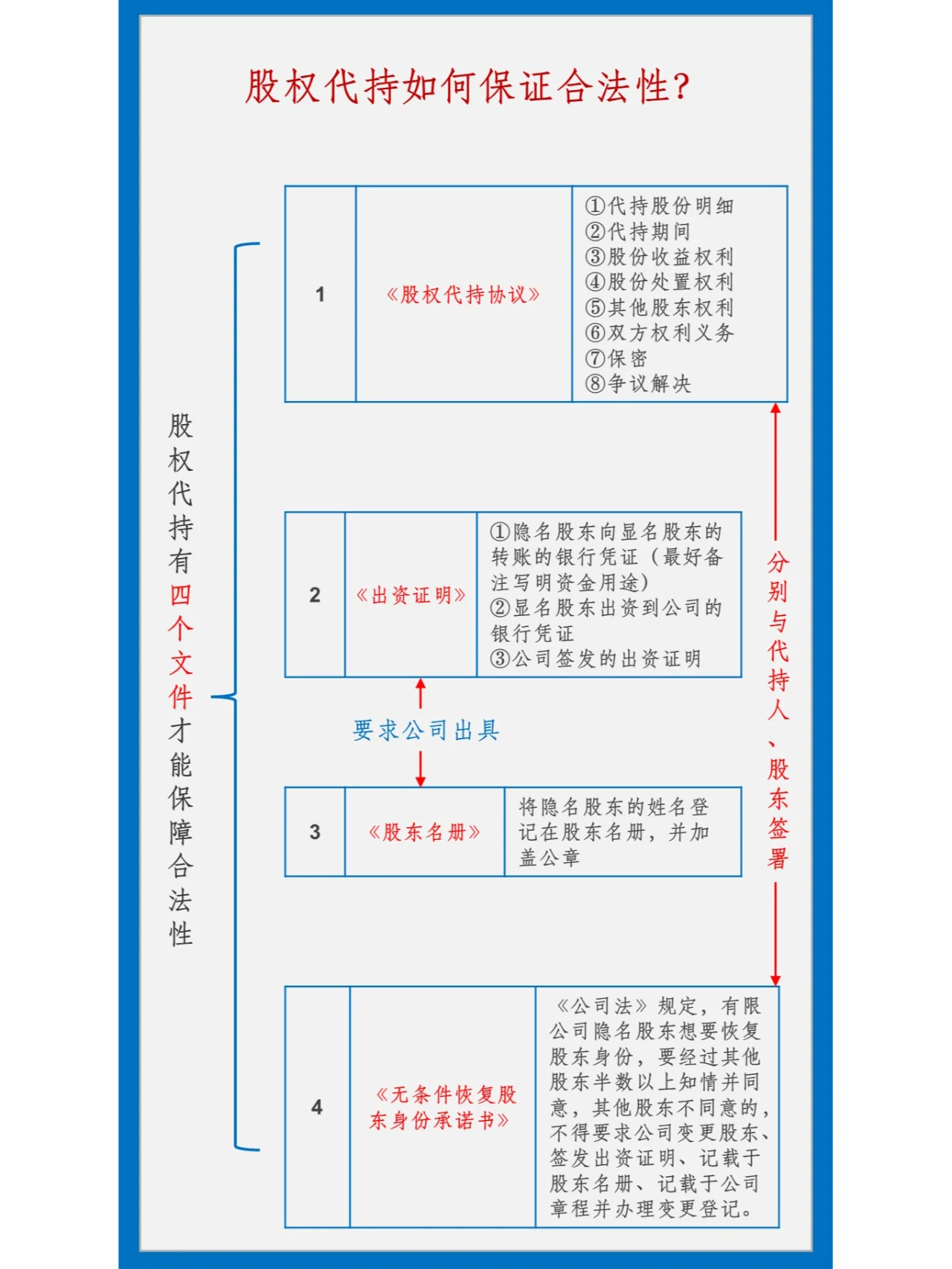 有四个文件可以确保股权代理持有的合法性: 第一个要求是要有《股权持有协议》,只要不存在《民法典》规定的无效理由,该协议通常被视为有效。 第二项要求是提供出资证明,包括: ① 匿名股东向知名股东转让资金的银行凭证(最好附有注明资金用途的说明); ② 指定股东向公司出资的银行凭证(附说明资金用途的说明); ③ 公司出具的出资证明书。 第三,公司需要有“股东名册”,注册代理人为知名股东,委托人为匿名股东,并加盖公章。 四是《无条件恢复股东身份承诺书》。根据《公司法》,如果有限公司的休眠股东希望恢复其股东身份,他们必须获得其他股东过半数的知情和同意。其他股东不同意的,不得要求公司变更股东、出具出资证明、记入股东名册、载入公司章程、办理变更登记。 因此,在代表股东签字时,请其他股东签署一份无条件恢复股东身份的承诺,同意当匿名股东希望在未来某一天恢复其股东身份时,其他股东将无条件同意。