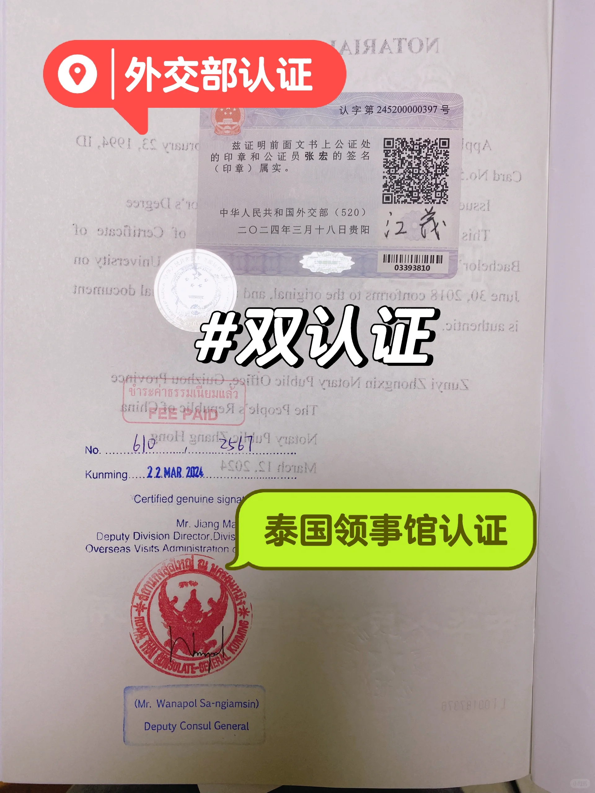 什么是泰国双重认证 所谓双重认证,是指很快就会需要的身份证明文件公证处进行公证-外交部认证-经泰国领事馆认证。这样,我们的文件将在泰国具有法律效力。 接下来,让我与您分享我的双重身份验证过程: 首先,联系户籍所在县或市的认证中心,告诉他们你需要双重认证的材料以及你需要认证的副本数量。你可以亲自去,也可以请朋友代你处理。我选择了运输方式来处理。公证过程相当快,需要一天半的时间才能完成。公证240份,¥20份。 在从公证处获得公证文件后,请提供公证材料和身份证将被带到户籍所在地的省级外事办公室进行身份验证。经外交部认证后,我们将帮助您将其交付给泰国领事馆完成 双重身份验证。一站式服务!你不必自己到处乱跑!双重身份验证完成后是否会有电弧通知我是选择了收集、自行收集还是再次邮寄邮寄[整月R](双重认证见图片详情,两份,共计1475日元) 附言除了去户籍所在地的外事办公室,你还需要去现场办理全程吗完成它! ️ 申请紧急复印件50.我会在15日把材料送到外事办公室,27日打电话通知我处理完毕 哦,中间还有4个周末,这个速度真快!!! 在选择自己处理之前,您是否咨询过第三方机构1000,紧急订单这个紧急的价格差真的很大 这是我的双重身份验证过程,我希望它是为那些需要它的人准备的参考资料
