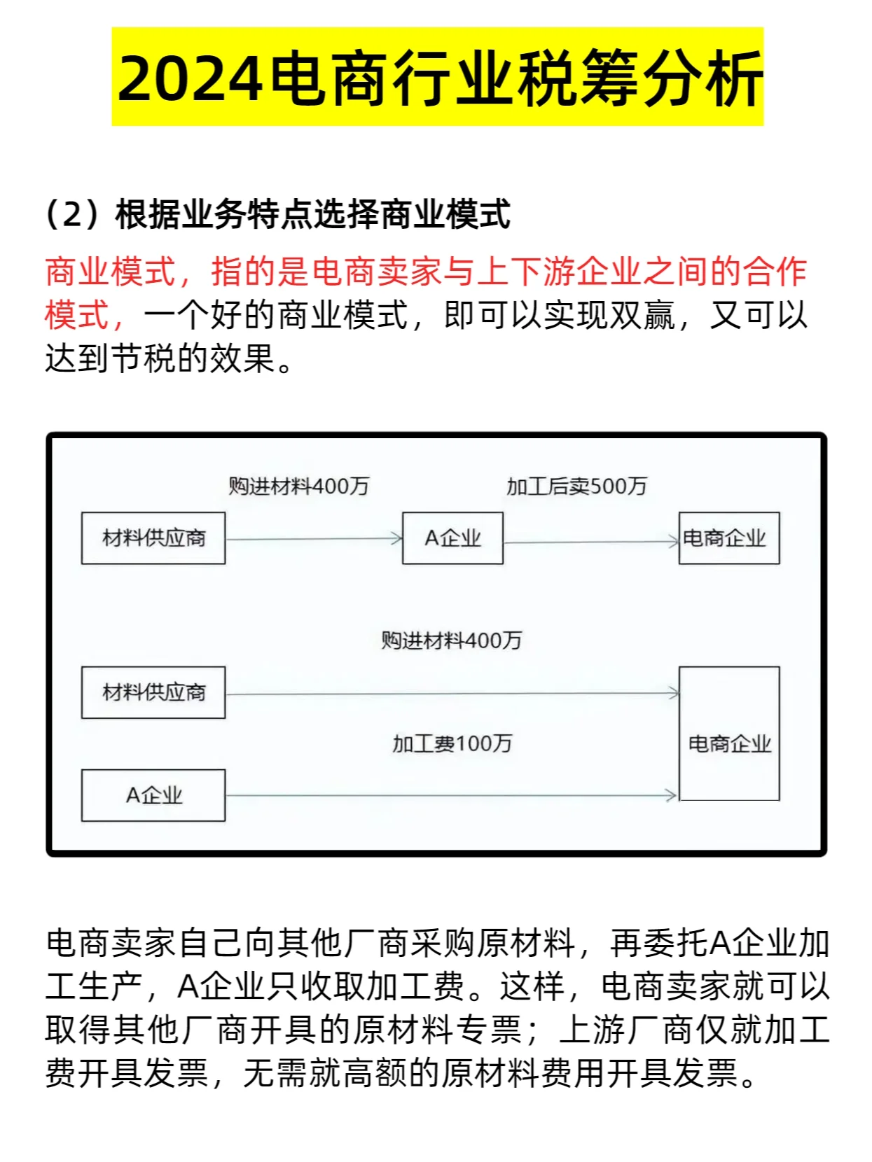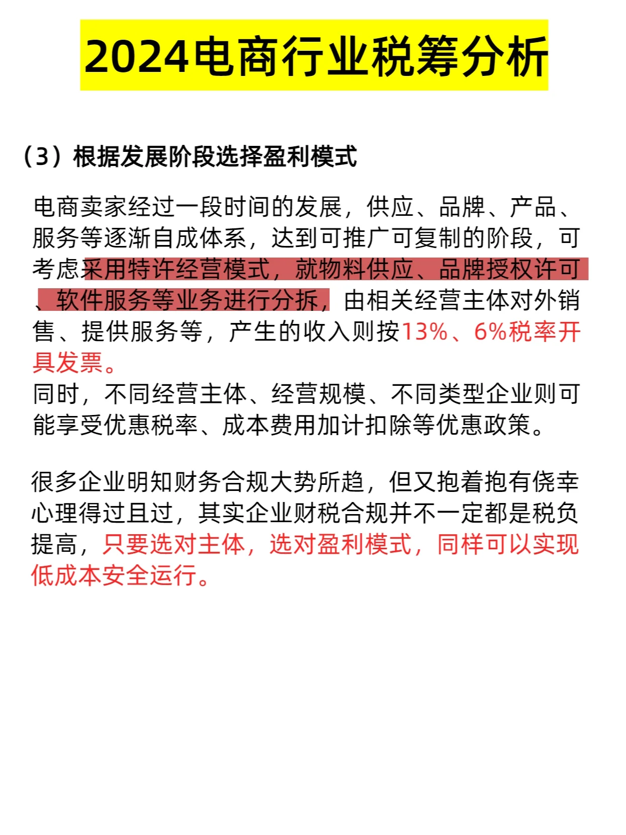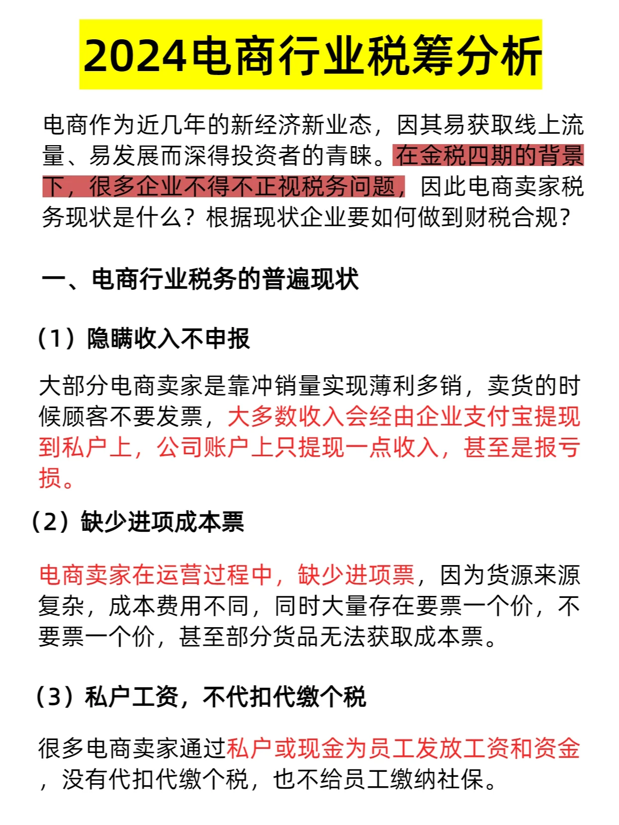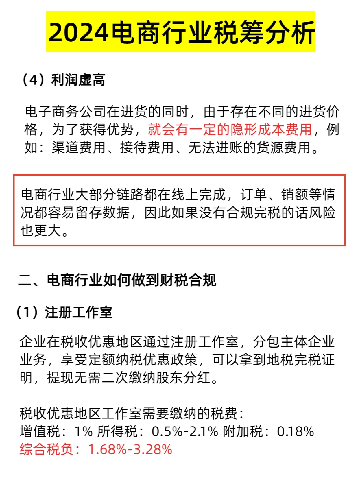 在黄金税第四阶段的背景下,许多企业不得不直面税收问题。 我们先来分析一下电子商务行业的税收概况 大多数电子商务行业会面临这三个问题吗 1.未申报私账收款 2.输入成本发票缺失 3.兼职人员工资分配 我们如何实现财务和税务合规 要结合个体工商户核定征收、有限公司退税、灵活用工平台三大“工具”,实现合规节税 1.核定征收:使用核定个体工商户申报收入,500万元以下电子商务综合税负在1%左右。 2.有限公司:开展业务分包,最高退税90%,解决进项成本发票、增值税高等问题。 3.灵活用工:通过灵活用工平台向兼职员工发放工资,平台提供6%的发票,解决兼职员工的工资分配问题。 许多公司都意识到财务合规的趋势,但事实上,抱着侥幸心理,仅仅过得去,企业的财务和税收合规并不一定意味着税收负担的增加。只要你选择了正确的实体,选择正确的盈利模式,是否也可以实现低成本和安全的操作。