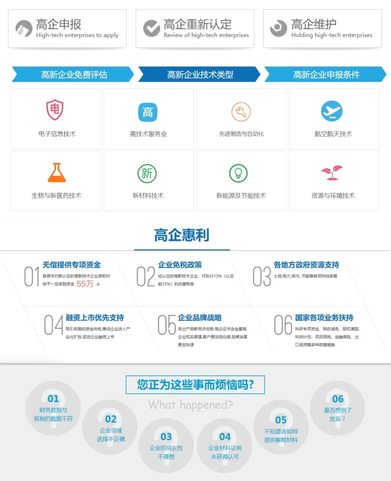 为什么这么多公司申请高科技企业今天我们来分析一下 首先,我们需要理解高科技企业的含义: 高新技术企业是指在政策支持(国家重点支持的高新技术领域)范围内,利用高新技术在新的或现有的产业中进行创新和运营,从而形成自主核心知识产权壁垒,并成功将知识产权成果转化为商业价值以获取利润的企业。 综上所述: 这类企业属于知识密集型高端企业。它们不仅可以增强中国的尖端技术实力,还可以增强企业在市场经济环境中的竞争力,创造更多的经济和社会价值。 言归正传,哪些国家为高新技术企业的认定提供政策支持 ① 减税:经认定的高新技术企业可执行15%(前25%)的优惠税率,税率降低10个百分点,税额降低40%; ② 直接奖励:获得高新技术认可后,可获得当地资助奖励(视地区而定); ③ 融资贷款:更容易获得VC的投资和主要银行的贷款。当银行收紧贷款政策时,高科技企业可以申请无担保信用贷款; ④ 资金基础:是其他类型政府专项资金的首要条件之一,是申请瞪羚企业和政府专项资金必备条件; ⑤ 品牌提升:科技企业唯一的“国字号”品牌企业荣誉,而电子商务时代大大有利于促进跨区域交易,这是企业实力的最佳象征; ⑥ 企业上市:创业板、新三板上市的重要条件之一; ⑦ 政府采购:高科技企业产品优先纳入政府采购体系; ⑧ 办公改善:优先获得办公和工业用地,许多地方还可以免费使用土地; ⑨ 资产折旧:固定资产加速折旧有利于财务报表; 10吸引人才:技术创业的核心是优秀人才,这样才能更好地吸引他们。