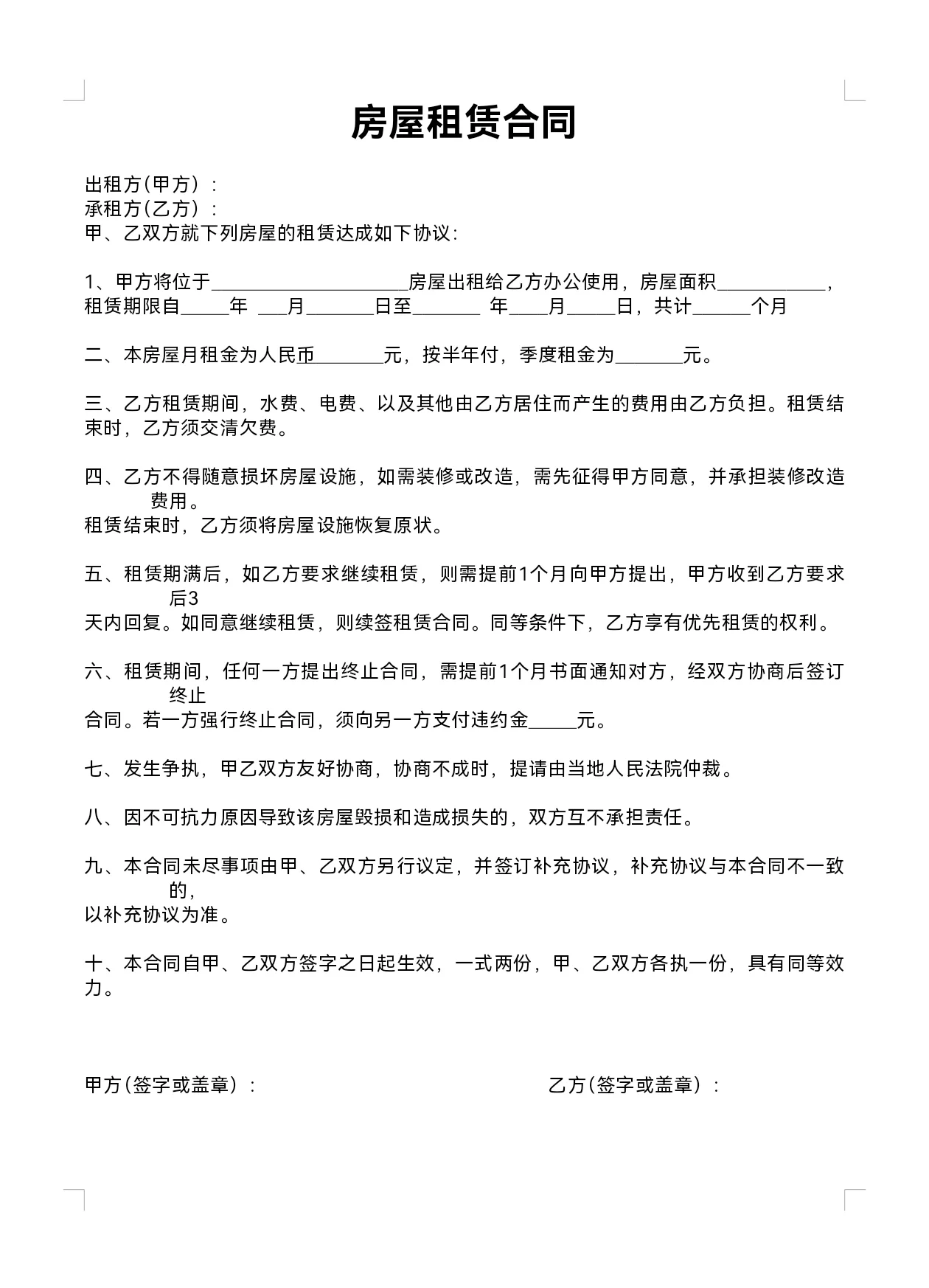 房屋租赁合同 出租方(甲方): 承租方(乙方): 甲、乙双方就下列房屋的租赁达成如下协议: 1、甲方将位于房屋出租给乙方办公使用,房屋面积 2、租赁期限自____年____月____日至____年____月____日,共计____个月 本房屋月租金为人民币____元,按半年付,季度租金为____元。 3、乙方租赁期间,水费、电费、以及其他由乙方居住而产生的费用由乙方负担。租赁结束时,乙方须交清欠费。 4、乙方不得随意损坏房屋设施,如需装修或改造,需先征得甲方同意,并承担装修改造费用。 租赁结束时,乙方须将房屋设施恢复原状。 5、租赁期满后,如乙方要求继续租赁,则需提前1个月向甲方提出,甲方收到乙方要求后3 天内回复。如同意继续租赁,则续签租赁合同。同等条件下,乙方享有优先租赁的权利。 6、租赁期间,任何一方提出终止合同,需提前1个月书面通知对方,经双方协商后签订 终止合同。若一方强行终止合同,须向另一方支付违约金____元。 7、发生争执,甲乙双方友好协商,协商不成时,提请由当地人民法院仲裁。 8、不可抗力原因导致该房屋毁损和造成损失的,双方互不承担责任。 9、本合同未尽事项由甲、乙双方另行议定,并签订补充协议,补充协议与本合同不一致以补充协议为准。 本合同自甲、乙双方签字之日起生效,一式两份,甲、乙双方各执一份,具有同等效力。 甲方(签字或盖章): 乙方(签字或盖章):