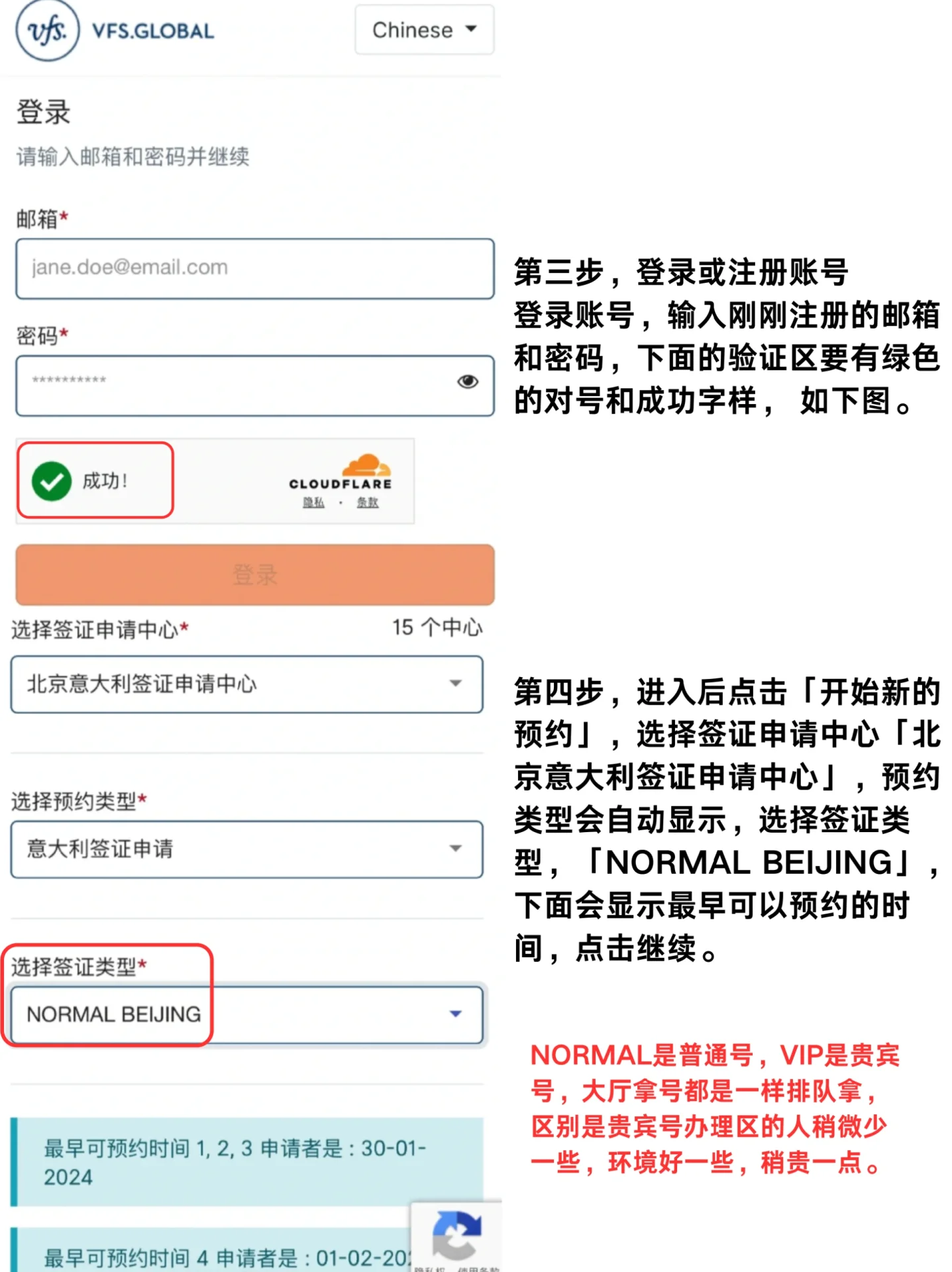 第一步是先登录 两种登录方式: 1.搜索VFS Global,“签证申请”,“意大利签证申请” 2.登录官方网站,如图2所示。 第二步,预约签证,确认预约时间,并立即预约 步骤3,登录或注册帐户 登录帐户,输入新注册的电子邮件和密码,下面的验证区域应该有一个绿色的复选框和“成功”字样,如下所示。 第四步,进入后,点击“开始新预约”,选择签证申请中心“北京意大利签证申请中心”。约会类型将自动显示。选择签证类型,最早的预约时间将显示在“正常北京”下。单击继续。 NORMAL是一个常规号码,VIP是一个VIP号码,大厅里排队等候该号码的队伍是相同的。不同的是,VIP号码处理区的人略少,环境更好,价格略贵。 第五步,添加联系方式,根据您的护照填写,然后继续下一步。每个注册帐户丢失只能添加一个联系人,并且只能安排一个人。 步骤6,点击一次性密码(OTP)生成OTP。验证码将发送到注册的电子邮件中,并填写以表示验证成功。 第7步,选择日期和时间。 第8步,选择服务,包括VIP服务、照片、复印件等。如果你已经准备好了,你不需要选择这个选项。 最后一步是确认并支付、核实个人信息和服务费。如果没有添加服务,则为0元。“接受条款”和“确认”。成功后,将收到一封预约电子邮件,附件将在处理的同一天打印出来并随身携带。