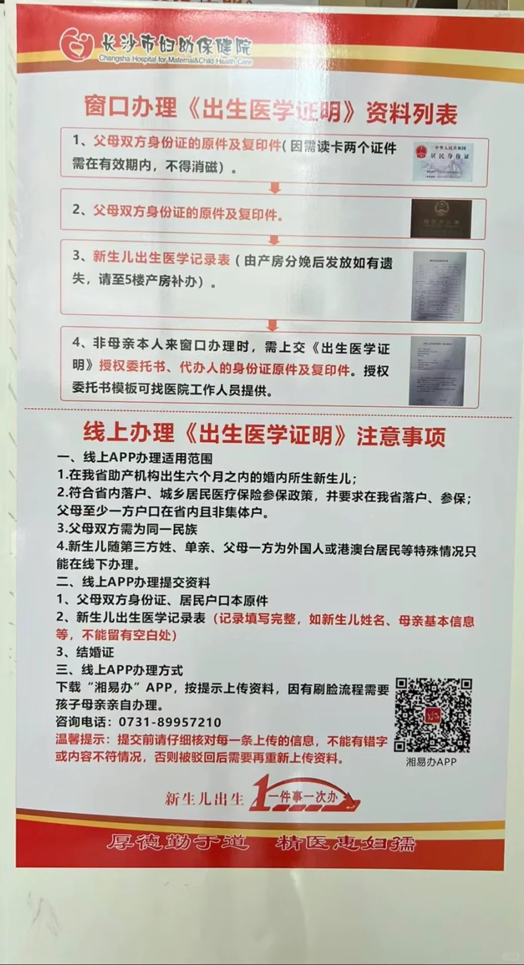 新生儿出生后办理的第一个证,可以出生医院窗口办理,也可以线上办理。记得提前取好姓名,在婴儿出生1.个月内办理完毕,特殊原因最迟不超过6.个月。 窗口办理资料: 父母双方身份证原件以及复印件(因需读卡两个证件需在有效期内,不得消磁) 父母双方户口本原件以及复印件 新生儿出生医学记录表(产房分娩后发放) 非母亲本人需要上交《出生证明医学证明》授权委托书、代办人的身份证原件以及复印件 线上办理材料(下载“湘易办”应用程序) 父母双方身份证和户口本原件 新生儿出生医学记录表 结婚证 注意事项: 1.线上办理有适用范围 在我省助产机构出生六个月之内的婚内所生新生儿 符合省内落户、城乡居民医疗保险参保政策,并要求在我省落户、参保 父母至少一方户口在省内且非集体户 父母双方需为同一民族 新生儿随第三方姓、单亲、父母一方为外国人或者港澳台居民等特殊情况只能现下办理。 2.线上办理需要母亲亲自办理,因为需要刷脸。 3.出生证明办理为免费 4.出生证明分正页、副页和存根,在办理户口登记之前,正页和副页不得私自拆切,否则将为无效证件 5.后续其他证件均依赖出生证明,所以最好尽快办理