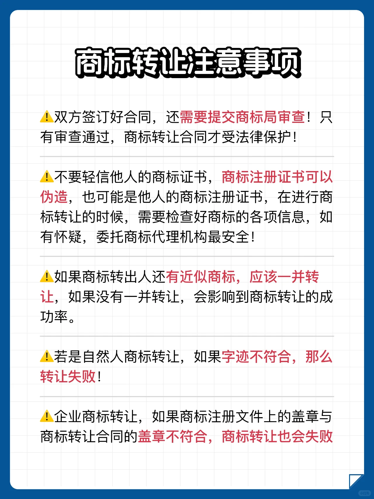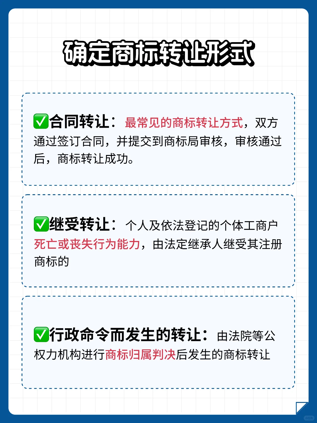 商标转让的定义: 商标注册人在注册商标有效期内,依照法定程序将商标专用权转让给他人的行为。 中国商标转让的常见形式有: ① 合同转让:商标转让最常见的方式是双方签订合同并提交商标局审查。审查通过后,商标转让成功。 ② 继承转让:是指个人或者依法登记的个体工商户死亡或者丧失法律行为能力后,法定继承人对注册商标的转让 ③ 行政命令引起的转让:法院或其他公共机构对商标所有权作出判决后发生的商标转让 商标转让流程: ① 买卖双方签署商标转让合同/协议。 ② 商标持有人通常在3-5个工作日内完成商标公证,并取得《商标声明公证证书》。 ③ 将准备好的材料和公证文件提交给商标局,然后支付转让费(通常为1000元)。 ④ 商标局将在1-2个月内发出受理函,并开始审查。 ⑤ 在商标局受理后5-8个月左右,将发布公告,并向双方颁发《注册商标转让核准书》 商标转让注意事项: ① 双方签署合同后,仍需提交商标局审查!只有通过审查,商标转让合同才能受到法律保护! ② 不要轻易相信别人的商标证书。商标注册证书可以是伪造的,也可以是他人的商标注册证书。转让商标时,有必要检查商标的所有信息。如果有任何疑问,请委托商标代理机构最安全! ③ 如果商标转让人拥有相似的商标,则应将其一并转让。如果不一起转让,将影响商标转让的成功率。 ④ 如果一个自然人的商标被转让,而且字迹不符,转让将失败! ⑤ 如果商标注册文件上的印章与商标转让合同上的印章不符,企业商标的转让也将失败