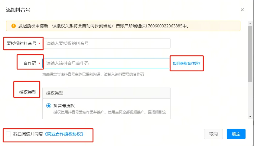 想在抖音上打个广告,让客户直接点击我的抖音私信,但我不知道如何绑定抖音才能放上去,今天我就教你如何绑定抖抖音。首先,在海量引擎账号工具中有一个抖音号授权。单击此处添加抖音号码。旁边是一个经过认证的抖音企业号。这是一个小小的好处。只要开通一个海量引擎账号,就可以免费认证抖音企业号。正常身份验证需要600元。添加抖音号,输入要绑定的抖音账号及其合作码。如果您不知道如何获取合作码,请单击下面的“如何获取合作代码”以明确说明。接下来,选择授权类型。抖音号授权就是全部授权,默认选择抖音号。如果您是主帐户,并且只授权一个视频,则可以选择单个视频授权。直播授权也是如此。申请完成后,您需要在抖音消息中的业务授权申请中点击“确定”。