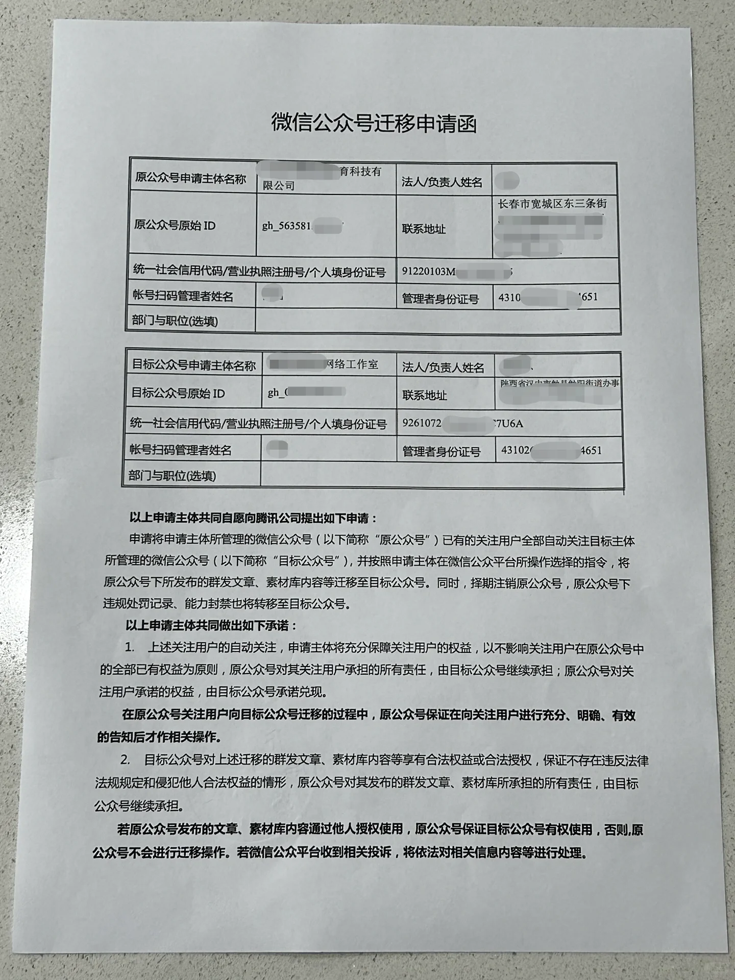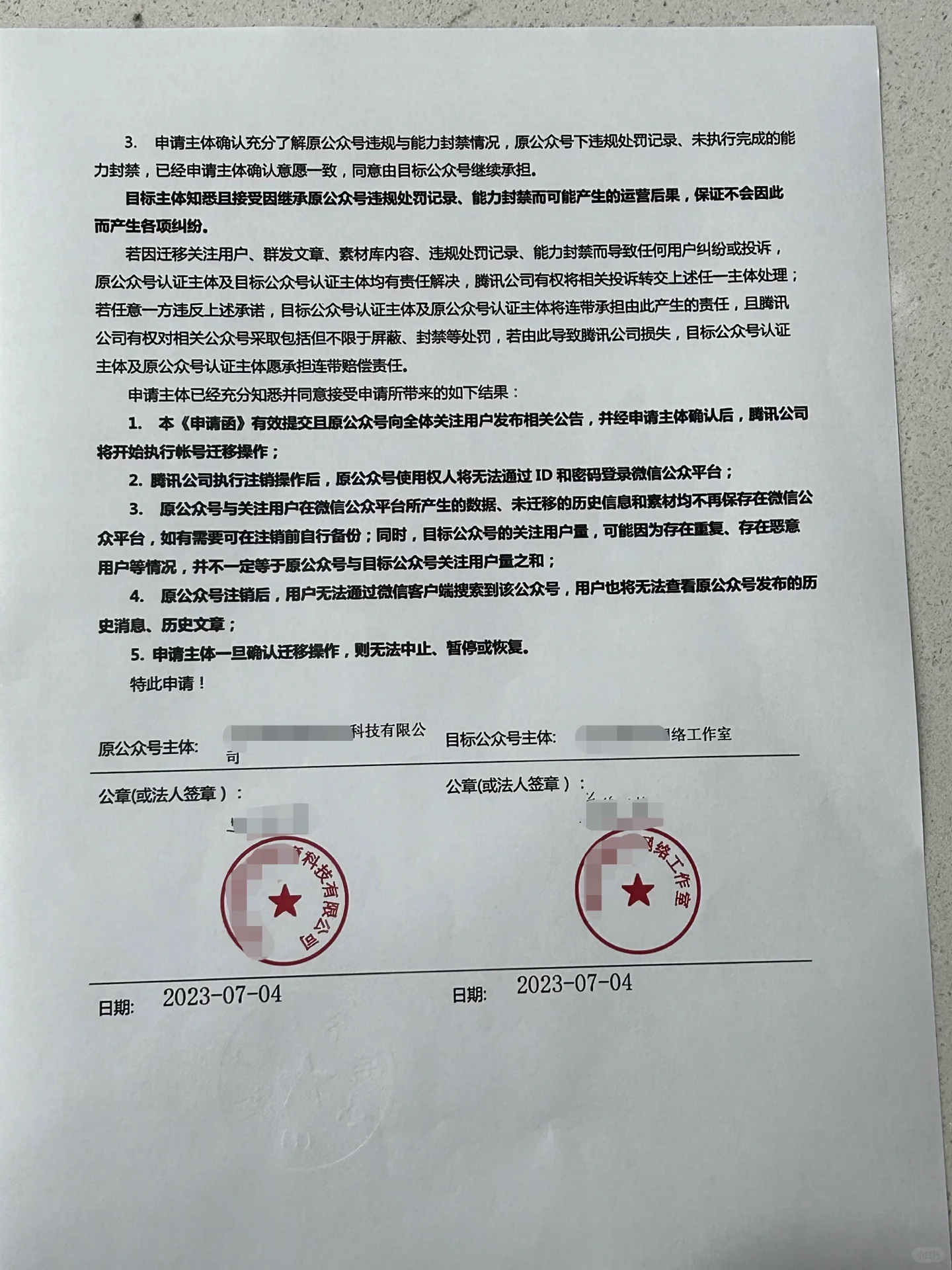 首先,弄清楚什么是公众号迁移 ️ 官方账户迁移是指将一个账户转移到另一个账户的过程 : 迁移微信公众号的目的是什么 一般来说,微信公众号的迁移有以下四个目的: 合并 更换主体 更改名称 迁移消息功能 公众号小伙伴都知道,公众号迁移不仅仅是提交迁移申请书,还要对迁移申请书进行公证 : 为什么我们需要对移民申请书进行公证 因为只有经过公证的移民申请书才具有法律效力,腾讯会予以认可 : 只有经过公证,才能将迁移申请书和公证证书提交给腾讯,最后等待审查才能完成迁移 那么我们应该如何公证呢 现在公证一般有两种方式 第一种方法是要求双方法人到公证处进行现场公证,或者要求双方代表到场公证(通常是代表在场的公司) 所需信息: 双方营业执照 法人身份证正反面 双方公众号后台设置截图 双方法人或负责人出席。如果原始帐户是个人帐户,则不能进行委派 第二种方法是在网上进行公证,将材料提交给网上公证机构,然后为您提供法定代表人面部识别的公证链接,完成公证 所需信息: 双方营业执照 法人身份证正反面 双方公众号后台设置截图 注:此类网络公证需要法定代表人配合人脸识别出具公证证书 第二种类型通常更简单,并且有最多的选择。第一种是离线的,也是最复杂、最耗时的 但如果网上法定代表人不能配合,我们应该如何公证 这也是许多账户所有者最常问的问题⁉️ 让我们以图1为例。由于他们的工作性质和其他各种原因,这家公司的法定代表人无法进行网上公证,更不用说线下公证了。我建议使用在线佣金让客户在线公证,然后出具转让公证证书。 所需信息: 双方营业执照 法人身份证正反面 双方公众号后台设置截图 双方授权书 注:客户端在线公证的方式也适用于小程序迁移的公证