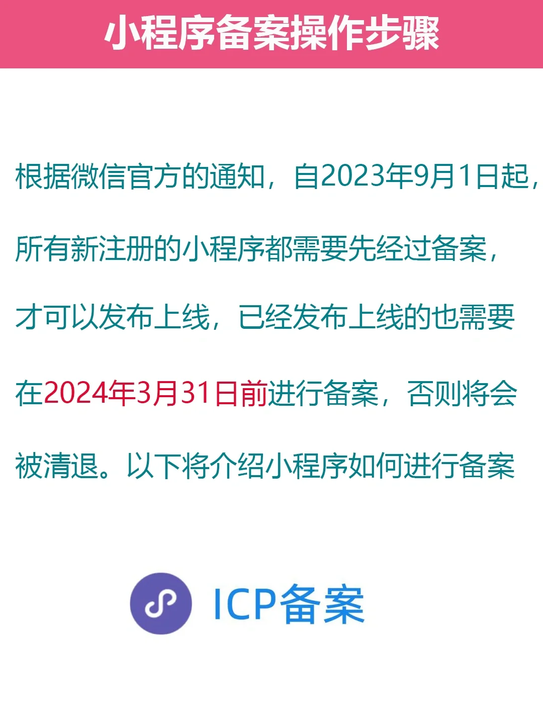 根据微信官方通知,从2023年9月1日起,所有新注册的小程序都需要注册后才能发布上线。那些已经发布和推出的人也必须在2024年3月31日之前注册,否则他们将被解雇。我们整理了小程序备案所需的材料和流程,让大家更容易理解。如果你是小程序的负责人,我相信有些人可能已经收到了小程序需要注册的通知。按照我们的介绍步骤,很容易上手。