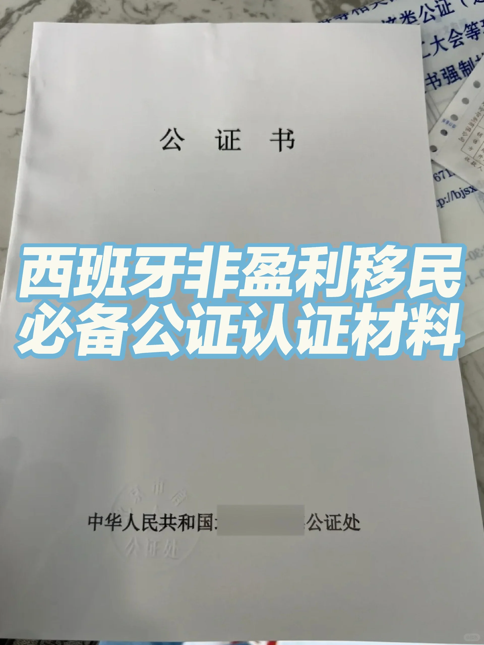 ️什么是西班牙非盈利移民签 西班牙的居留分为临时居留(暂住)和长期居留或永久居留(永久居住区) 西班牙非盈利移民则属于临时居留签证 西班牙非盈利移民,申请人只需持有足额可支配流动资金(即被动收入),无需投资、买房或创业,无技术、语言和居住要求,就可能实现全家移民西班牙,并可1+2+2转永居或入籍. 申请西班牙非盈利移民所需要的公证材料有: 1.婚姻类公证(结婚证公证/离婚证公证/已婚公证)(夫妻) 2.无犯罪记录公证(申请人) 3.孩子出生医学证明公证 4.银行流水公证 5.活期存款证明公证 6.房产证公证 如果有特殊情况还会需要办理房产出售或者是车辆出售的合同公证 7.体检报告证明公证(所有人) 8.夫妻一方带未成年孩子出行的话 ,不去的一方还需要办理一份不随行同意声明书公证和亲属关系公证 注意:如果文件不是中西对照的,公证书通常需要翻译成西语 西班牙属于海牙成员国,中国文件去西班牙使用需要办理海牙认证 公证+海牙认证(翻译西语) 提供扫描件,全程线上办理。无需️本人到场