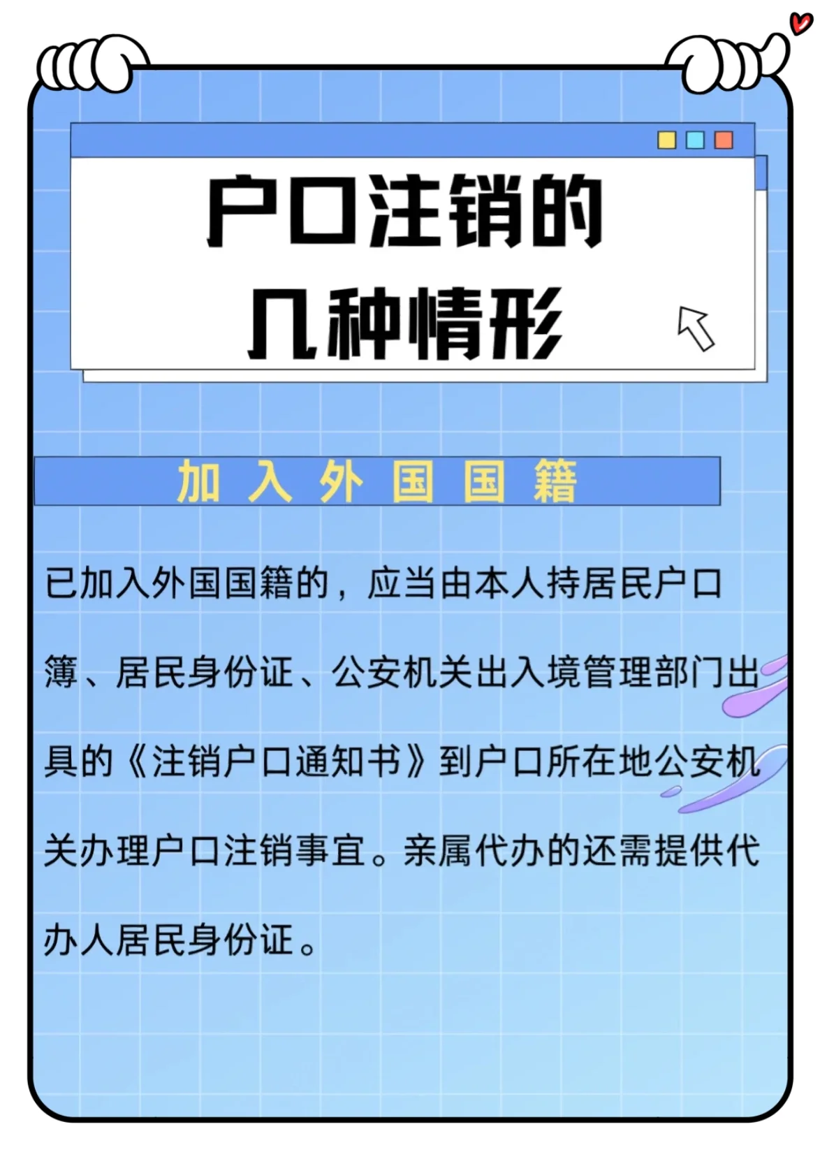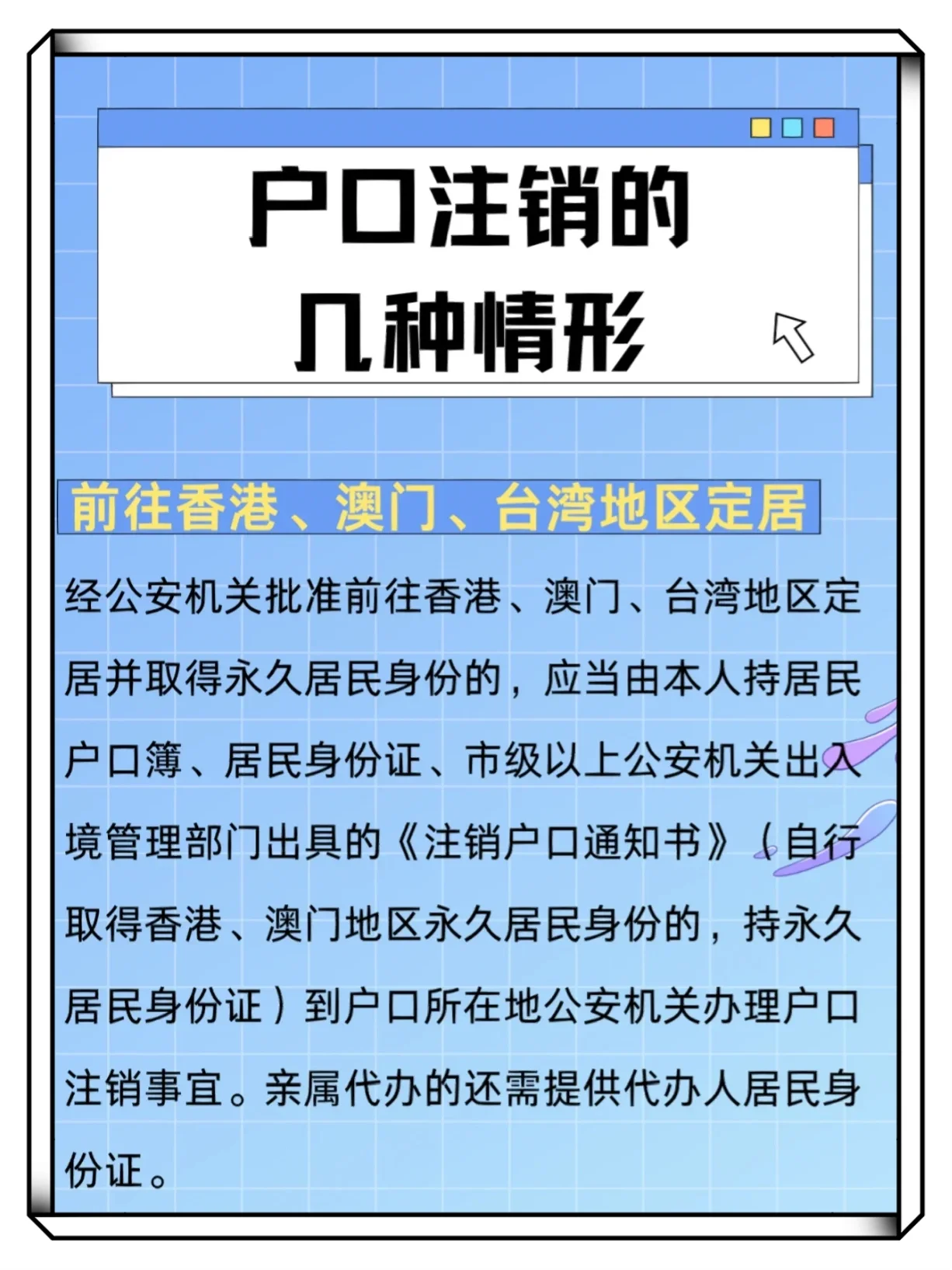 ️ 需要注销的几种情形‼️ 一、前往香港、澳门、台湾地区定居 经公安机关批准前往香港、澳门、台湾地区定居并取得永久居民身份的,应当由本人持居民户口簿、居民身份证、市级以上公安机关出入境管理部门出具的《注销户口通知书》(自行取得香港、澳门地区永久居民身份的,持永久居民身份正)到 所在地公安机关办理 注销事宜。亲属代办的还需提供代办人居民身份正。 二、加入外国国籍 已加入外国国籍的,应当由本人持居民 簿、居民身份正、公安机关出入境管理部门出具的《注销通知书》到 所在地公安机关办理注销事宜。亲属代办的还需提供代办人居民身份正。 三、死亡注销 本市居民死亡后1.个月以内,由户主、亲属或社(村)委会工作人员持本人身份正、死者居民簿、死者居民身份正、死亡证明向死者 所在地公安机关申报 注销事宜。 特别提醒 已加入外国国籍或在香港、澳门、台湾地区定居或死亡未按规定申报注销户口的,经调查核实后,公安机关将按规定流程注销其户口。 公安机关发现公民有两个以上常住户口的,户口所在地公安机关经调查核实,将按规定注销非法或错误登记的户口。 公民和单位采用隐瞒事实真相、编造虚假事实、提供虚假证明材料、冒用他人身份等手段,非法办理户口登记,经查证属实的,按规定注销户口或退回原籍。
