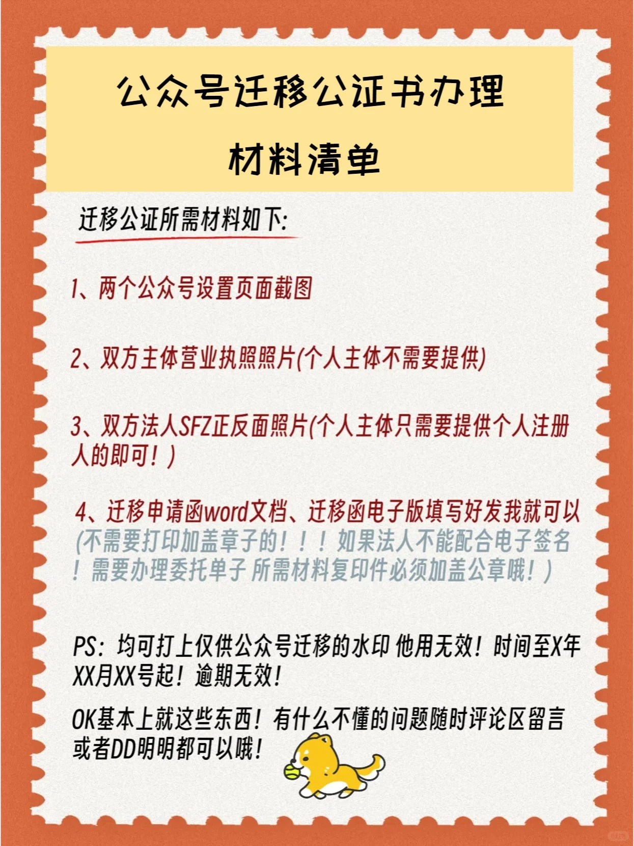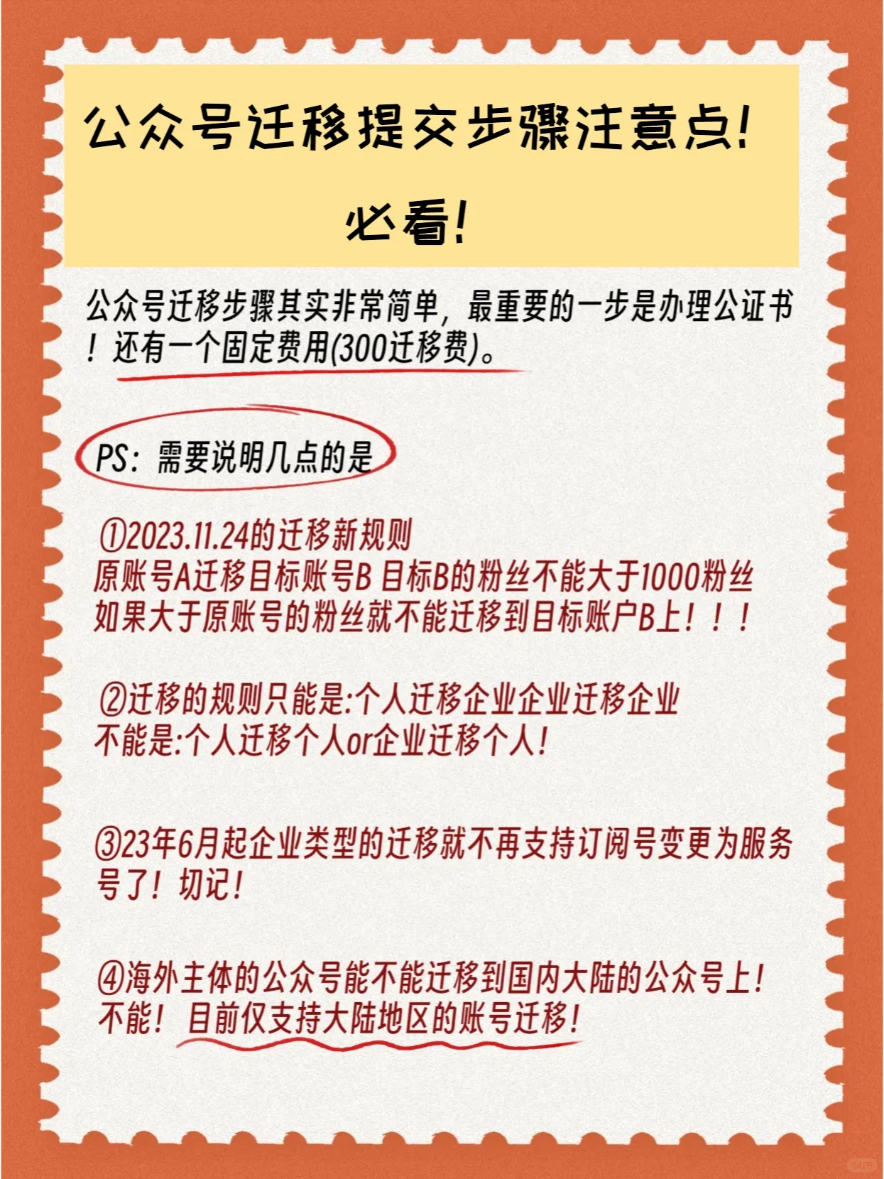 花了一天半的时间才完成公众号的迁移。事实上,这并没有想象中的那么难! 总的想法是! NO.1-注册一个新帐户!{企业账号类型不支持订阅号迁移服务号!}注册时,选择法人验证或公众号验证可免除300元认证费! NO.2-准备好材料上线公证和办理公证证书!{平台规则限制同一实体的两个帐户可以在没有公证证书的情况下迁移}无需任何工作即可满足此条件!在其他情况下,这是必要的!这里不建议办理公证证书。您可以选择在线申请或离线申请!每个人都有自己的优点和缺点!我选择在网上申请公证是因为我不想离线。如果我能把一件事做好一次,我就不会再花时间去做了!在线处理过程相对较快!基本上,材料将在20分钟内准备好!网上公证处的效率也比较高----我上传了网上公证材料清单的P3图片。如果你需要,你可以看看! NO.3-办理完公证证书后,直接登录原账号后台查找主体信息-点击账号迁移-进去确认账号迁移的具体内容-上传公证证书和迁移函-填写发票信息-支付300元迁移费-接听审计机构电话等待审核成功-两位账号管理员点击服务通知确认迁移-登录原账号下载发票-完成! NO.4-原账号被平台全程回收!帐户的身份验证状态基于目标帐户,自定义菜单与商城的第三方对接需要重置。我不在这里详述了! 最重要的一点是,申请公证证书的其他提交步骤并不困难,审查机构也很容易谈论。电话是在提交公证证书大约10分钟后打来的!审查在不到两个小时的时间里就成功了!难点在于公证过程。无论是公众号还是小程序的主体,其实都很简单!这只是办理公证的额外步骤!我在P4中也包含了注意事项,所以每个人都可以看看,避免处理办公室公证和提交。无法转移!
