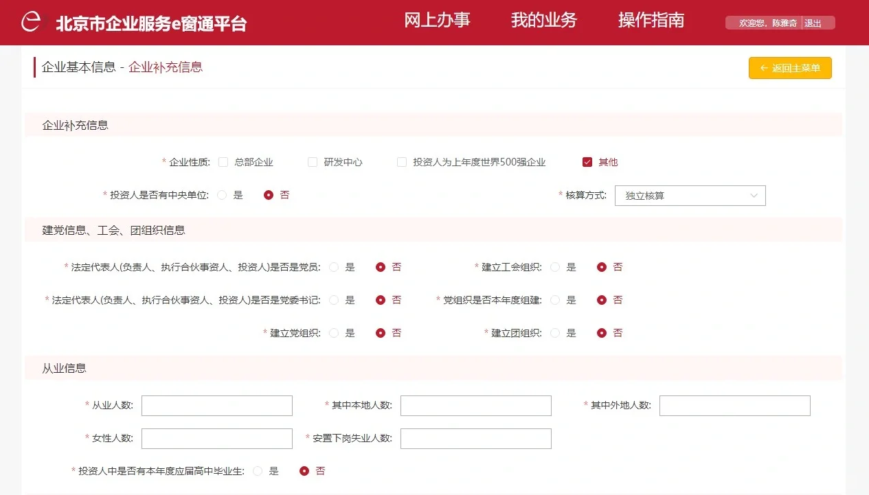 企业股东或法人变更流程: 1.登录“北京企业服务电子窗口平台”; 2.选择“公司服务”和“公司登录”,进入公司账户; 3.根据变更内容,选择不同的实体进入数据填报模块。 4.提交前,请务必选择“网上签名”或“窗口提交”。 5.等待审查,通常为2-3个工作日。 笔记: 1.公司注册(备案)申请表是根据电子窗口平台上填写的信息生成的。重要的是要确保信息与公司章程一致,例如投资时间,管理人员是选举、任命还是聘用的。 2.公司登记(备案)申请表可在大堂工作人员的指导下在指定区域加盖公章。指定代表页需要指定代理人签字;法定代表人的信息不涉及任何变更,也不需要签名。 3、公司章程中“认缴出资额”的单位应当标明“万元”。 4.需要变更人员的身份证或营业执照原件。 5.到窗口提交纸质材料,涉及变更的人员身份证需按要求粘贴。