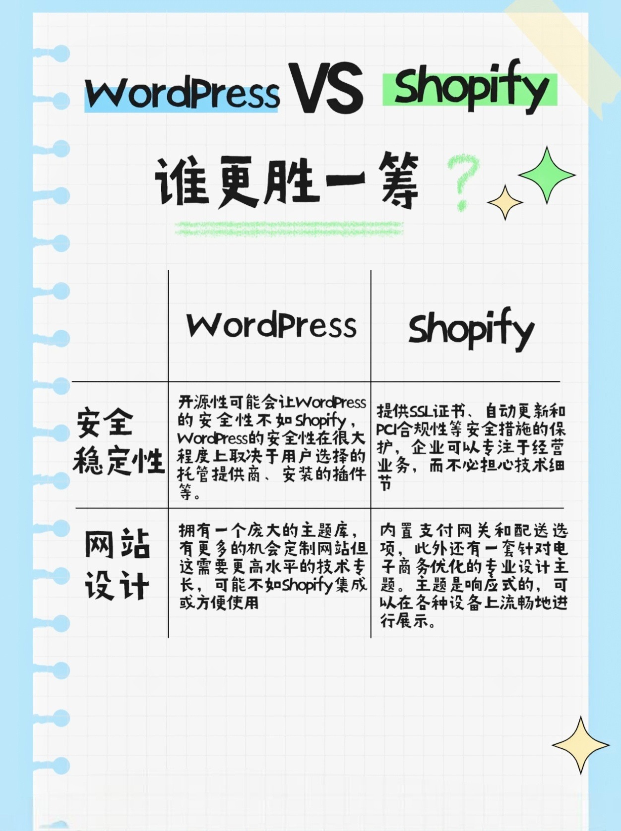 5、安全稳定性:WordPress的安全性取决于用户自己的防护设置,Shopify提供了较完善的安全防护