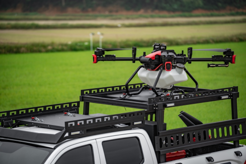 金刚炮新农人版一次性提供完整的模块化箱体,以及车顶无人机平台,可以同时装载两架植保无人机,单日能完成近千亩农田的植保作业。无人机载物架整体采用钢材结构,坚固耐用,承载力更强。